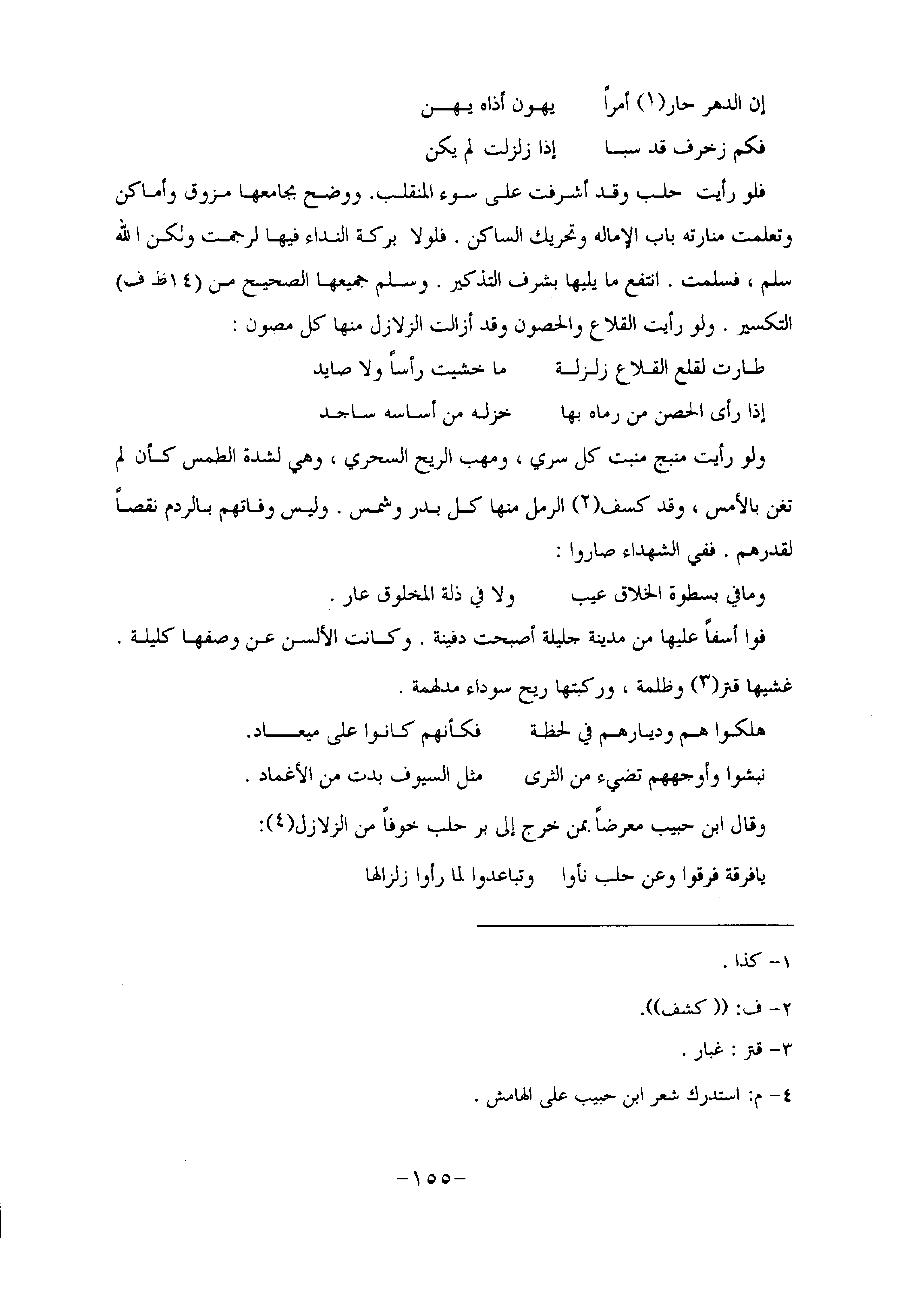فلو رأيت حلب وقد أشرفت على سوء المنقلب. ووضح بجامعها مزوق وأماكن وتعلمت منارته باب الإماله وتحريك الساكن. فلولا بركة النداء فيها لرجمت ولكن الله سلم، فسلمت. انتفع ما يليها بشرف التذكير. وسلم جميعها الصحيح من (14 ظ ف) التكسير. ولو رأيت القلاع والحصون وقد أزالت الزلازل منها كل مصون:
