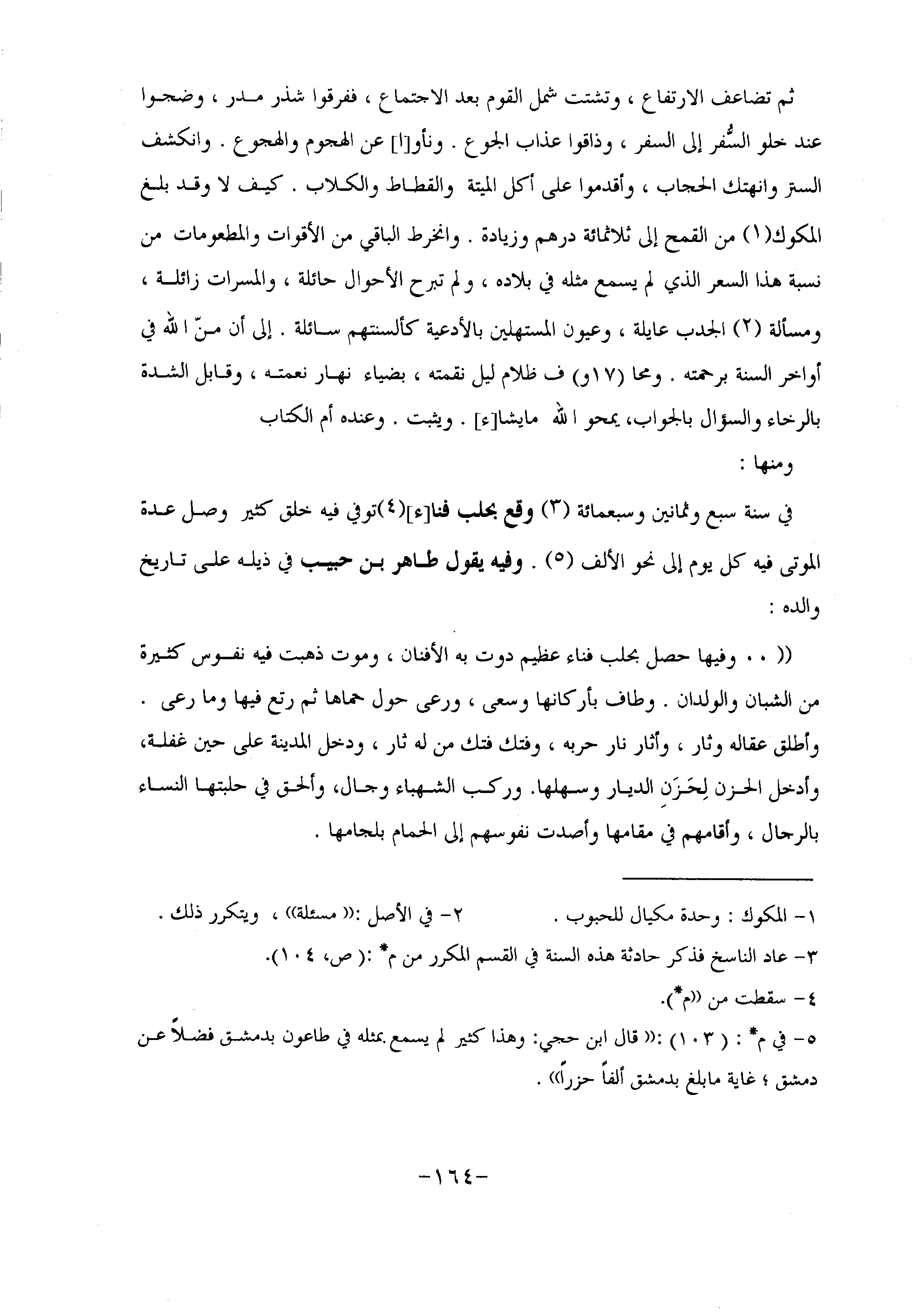 ثم تضاعف الارتفاع، وتشتت شمل القوم بعد الاجتماع، ففرقوا شذر مدر، وضجوا عند خلو السّفر إلى السفر، وذاقوا عذاب الجوع. ونأو [ا] عن الهجوم والهجوع. وانكشف الستر وانهتك الحجاب، وأقدموا على أكل الميتة والقطاط والكلاب. كيف لا وقد بلغ المكوك «1» من القمح إلى ثلاثمائة درهم وزيادة. وانخرط الباقي من الأقوات والمطعومات من نسبة هذا السعر الذي لم يسمع مثله في بلاده، ولم تبرح الأحوال حائلة، والمسرات زائلة، ومسألة «2» الجدب عايلة، وعيون المستهلين بالأدعية كألسنتهم سائلة. إلى أن منّ الله في أواخر السنة برحمته. ومحا (17 و) ف ظلام ليل نقمته، بضياء نهار نعمته، وقابل الشدة بالرخاء والسؤال بالجواب، يمحو الله ما يشا [ء] . ويثبت. وعنده أم الكتاب