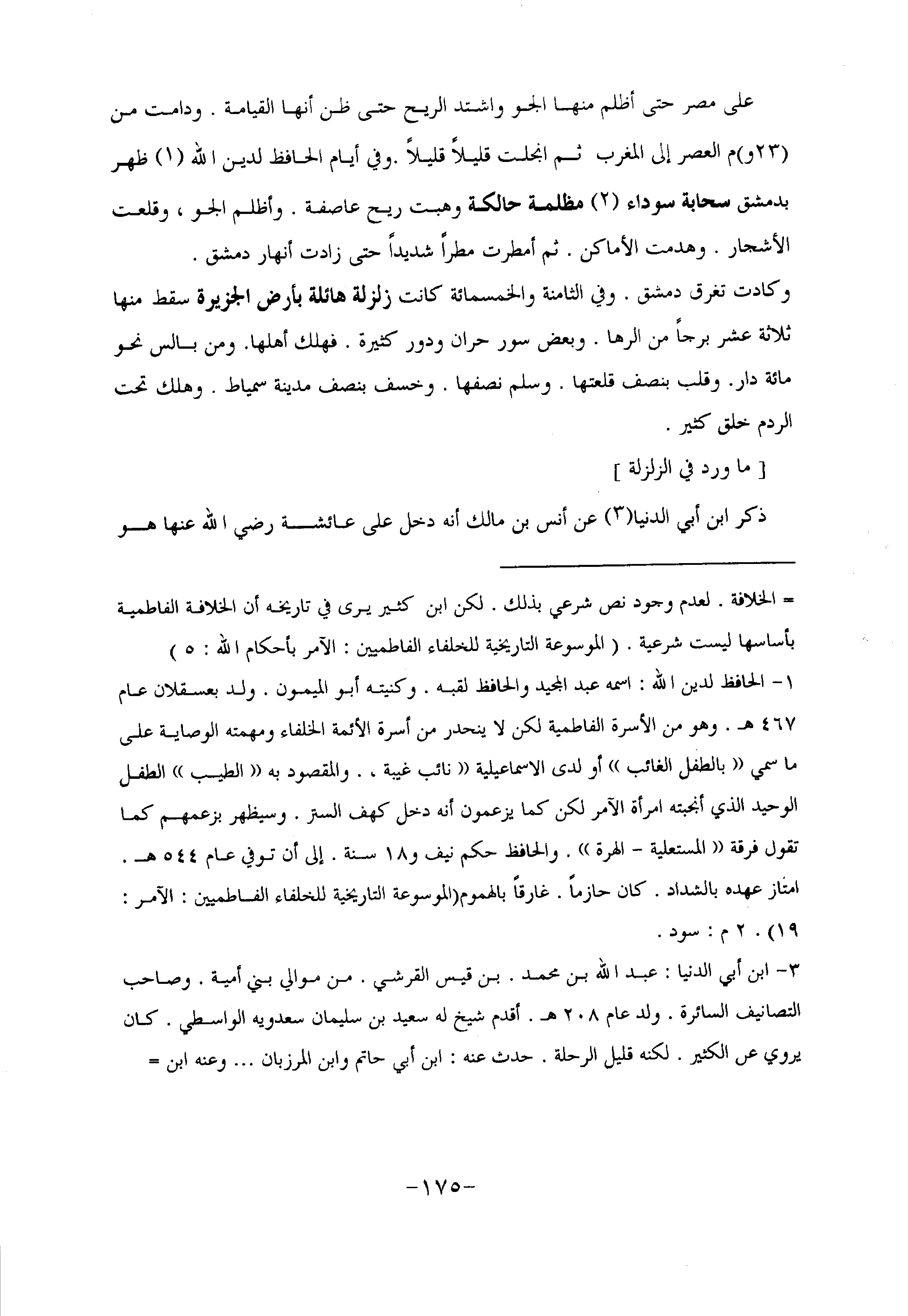 على مصر حتى أظلم منها الجو واشتد الريح حتى ظن أنها القيامة. ودامت من (23 و) م العصر إلى المغرب ثم انجلت قليلا قليلا. وفي أيام الحافظ لدين الله «1» ظهر بدمشق سحابة سوداء «2» مظلمة حالكة وهبت ريح عاصفة. وأظلم الجو، وقلعت الأشجار. وهدمت الأماكن. ثم أمطرت مطرا شديدا حتى زادت أنهار دمشق.