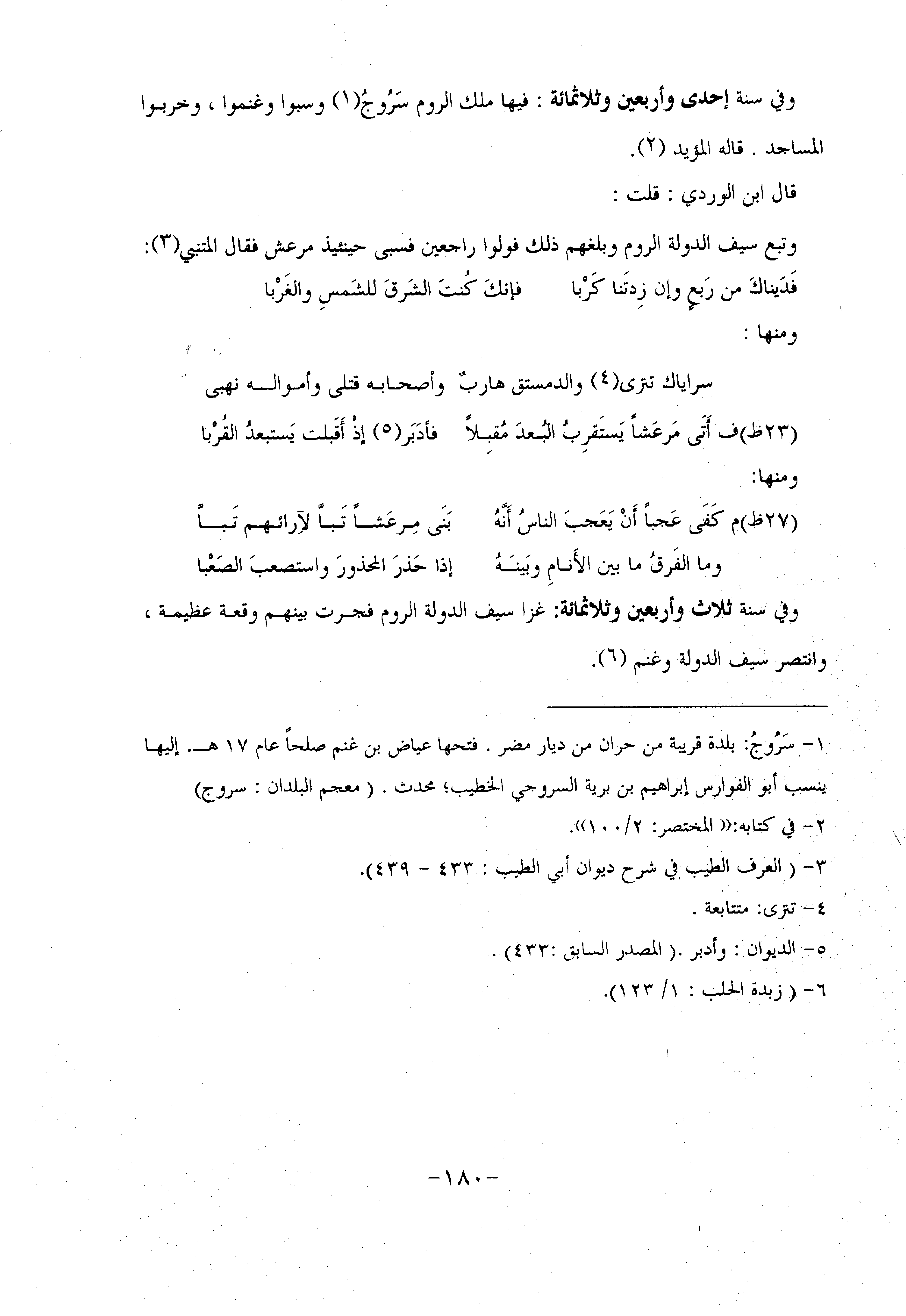 وتبع سيف الدولة الروم وبلغهم ذلك فولوا راجعين فسبى حينئيذ مرعش فقال المتنبي «3» :