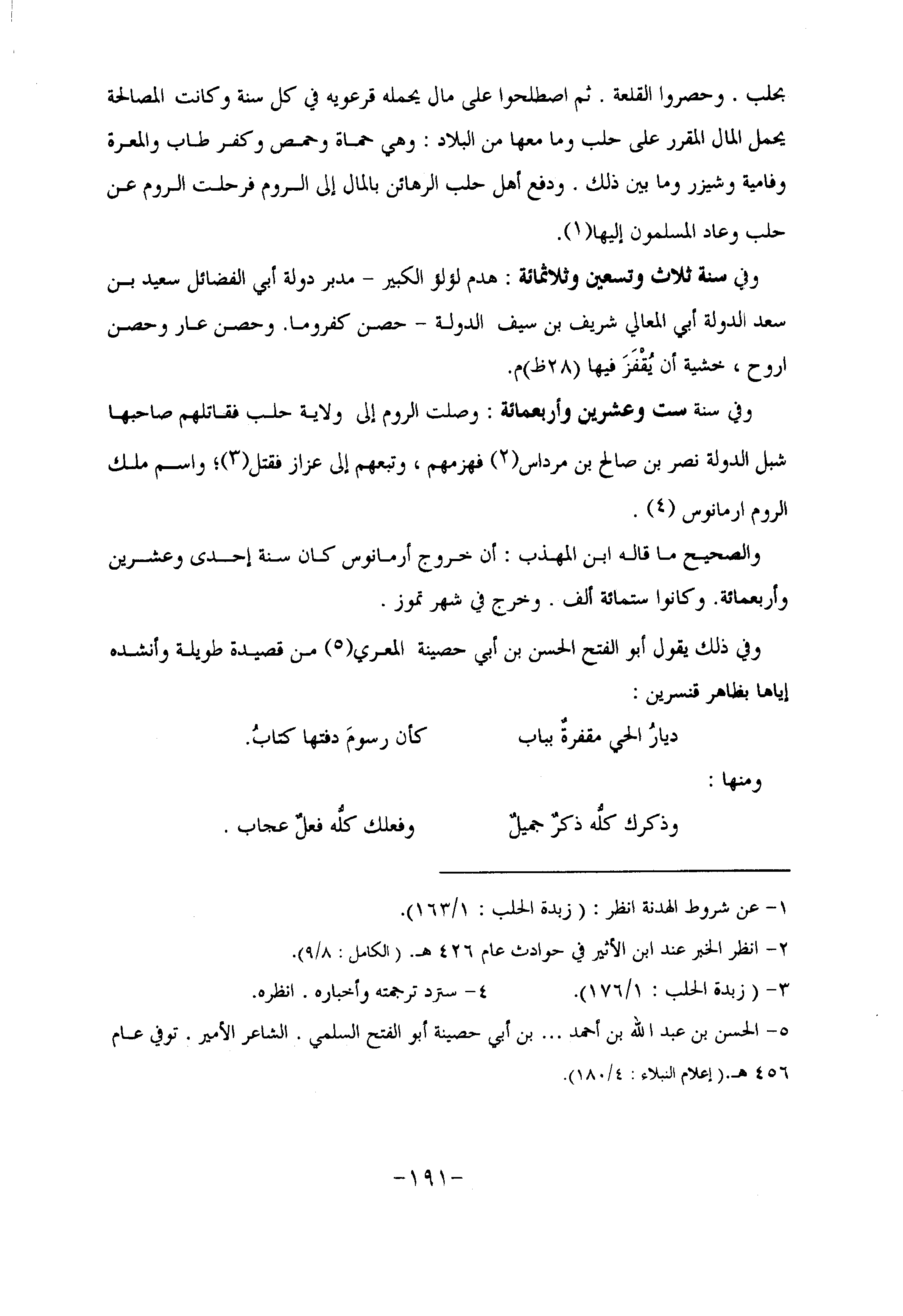 وفي ذلك يقول أبو الفتح الحسن بن أبي حصينة المعري «5» من قصيدة طويلة وأنشده إياها بظاهر قنسرين: