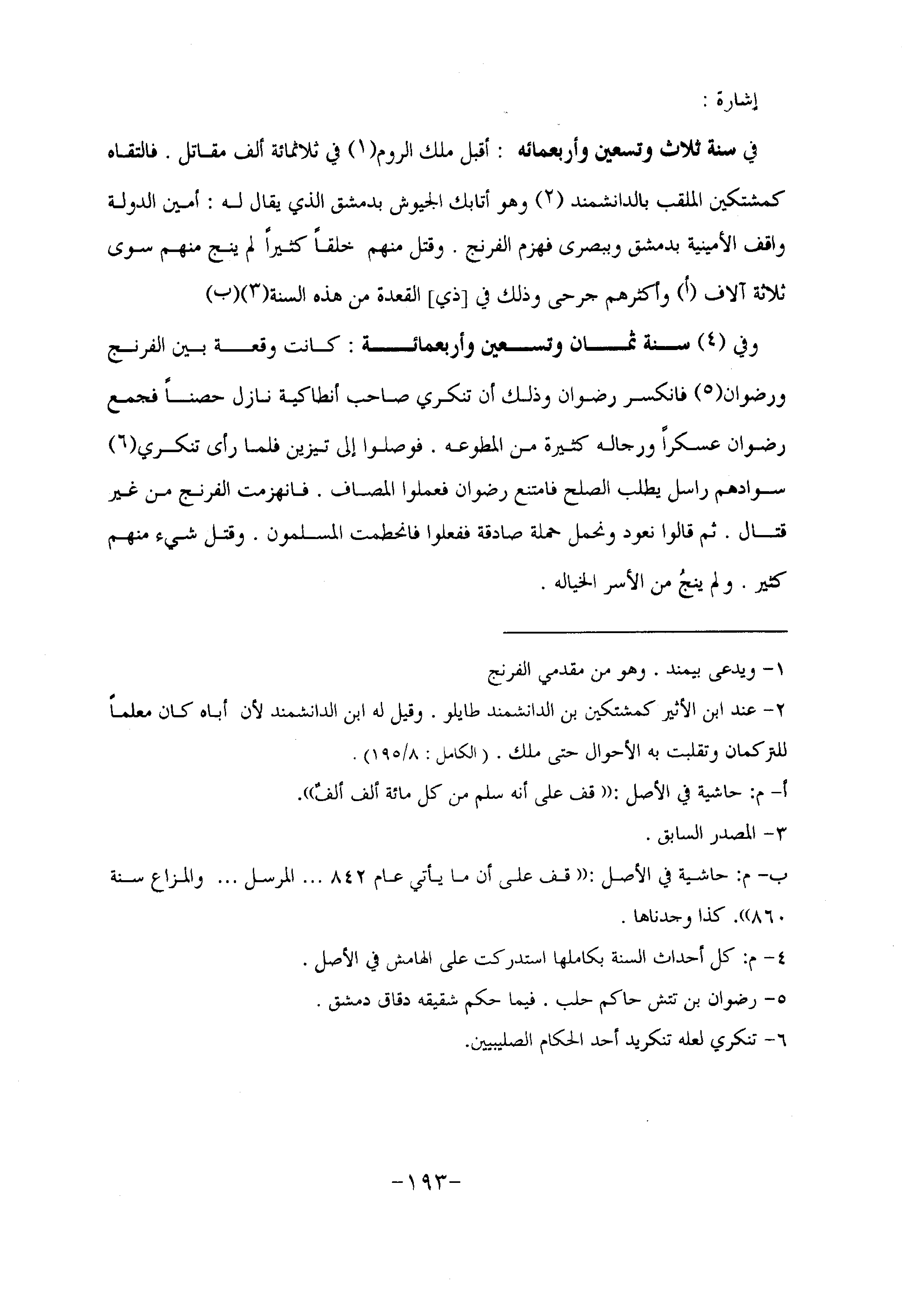 في سنة ثلاث وتسعين وأربعمائة: أقبل ملك الروم «1» في ثلاثمائة ألف مقاتل. فالتقاه كمشتكين الملقب بالدانشمند «2» وهو أتابك الجيوش بدمشق الذي يقال له: أمين الدولة واقف الأمينية بدمشق وببصرى فهزم الفرنج. وقتل منهم خلقا كثيرا لم ينج منهم سوى ثلاثة آلاف أوأكثرهم جرحى وذلك في [ذي] القعدة من هذه السنة «3» ب