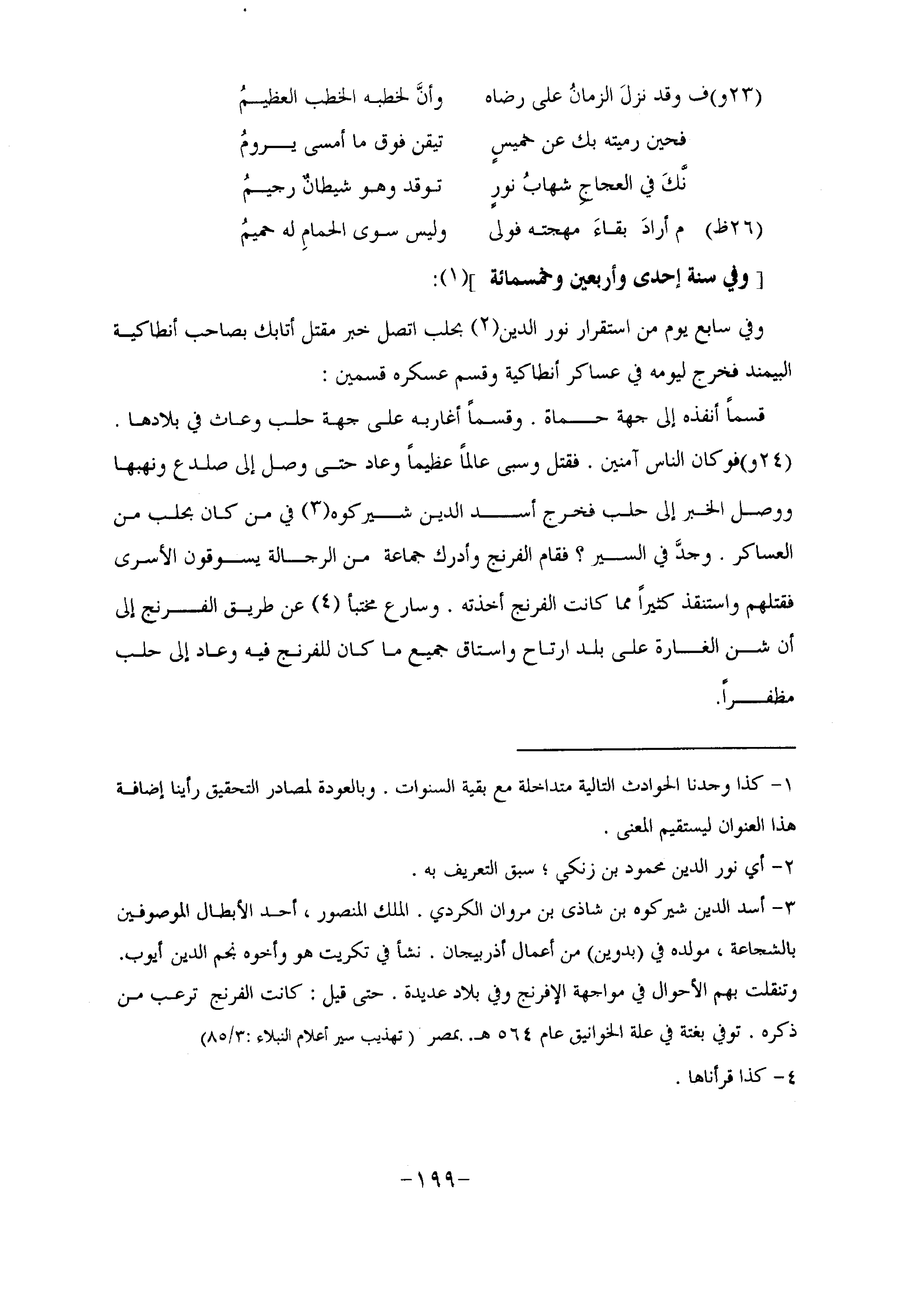 (24 و) فوكان الناس آمنين. فقتل وسبى عالما عظيما وعاد حتى وصل إلى صلدع ونهبها ووصل الخبر إلى حلب فخرج أسد الدين شير كوه «3» في من كان بحلب من العساكر. وجدّ في السير؟ فقام الفرنج وأدرك جماعة من الرجالة يسوقون الأسرى فقتلهم واستنقذ كثيرا مما كانت الفرنج أخذته. وسارع مختبأ «4» عن طريق الفرنج إلى أن شن الغارة على بلد ارتاح واستاق جميع ما كان للفرنج فيه وعاد إلى حلب مظفرا.