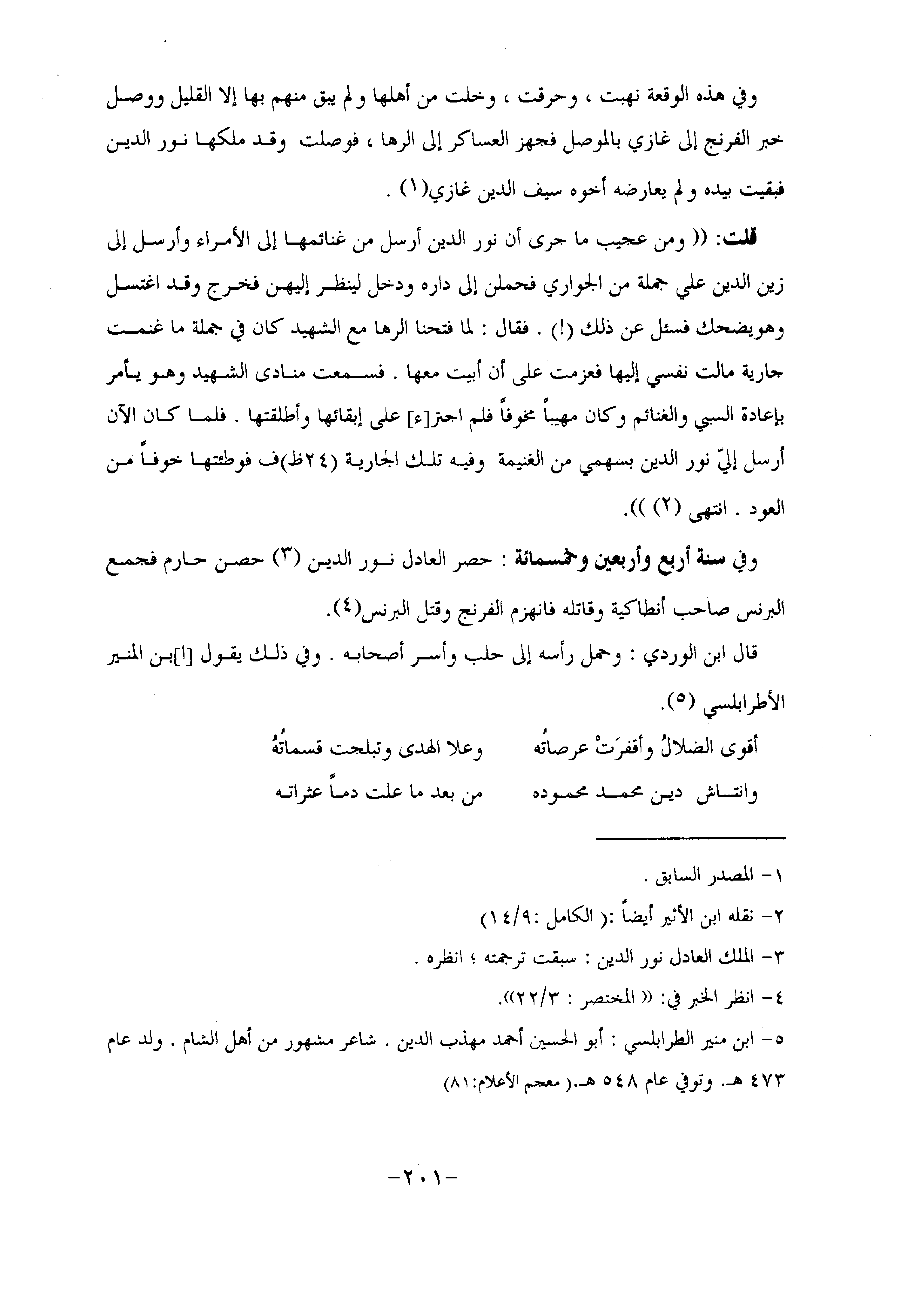 قلت: «ومن عجيب ما جرى أن نور الدين أرسل من غنائمها إلى الأمراء وأرسل إلى زين الدين علي جملة من الجواري فحملن إلى داره ودخل لينظر إليهن فخرج وقد اغتسل وهو يضحك فسئل عن ذلك (!) . فقال: لما فتحنا الرها مع الشهيد كان في جملة ما غنمت جارية مالت نفسي إليها فعزمت على أن أبيت معها. فسمعت منادى الشهيد وهو يأمر بإعادة السبي والغنائم وكان مهيبا مخوفا فلم اجتر [ء] على إبقائها وأطلقتها. فلما كان الآن أرسل إليّ نور الدين بسهمي من الغنيمة وفيه تلك الجارية (24 ظ) ف فوطئتها خوفا من العود. انتهى «2» » .
