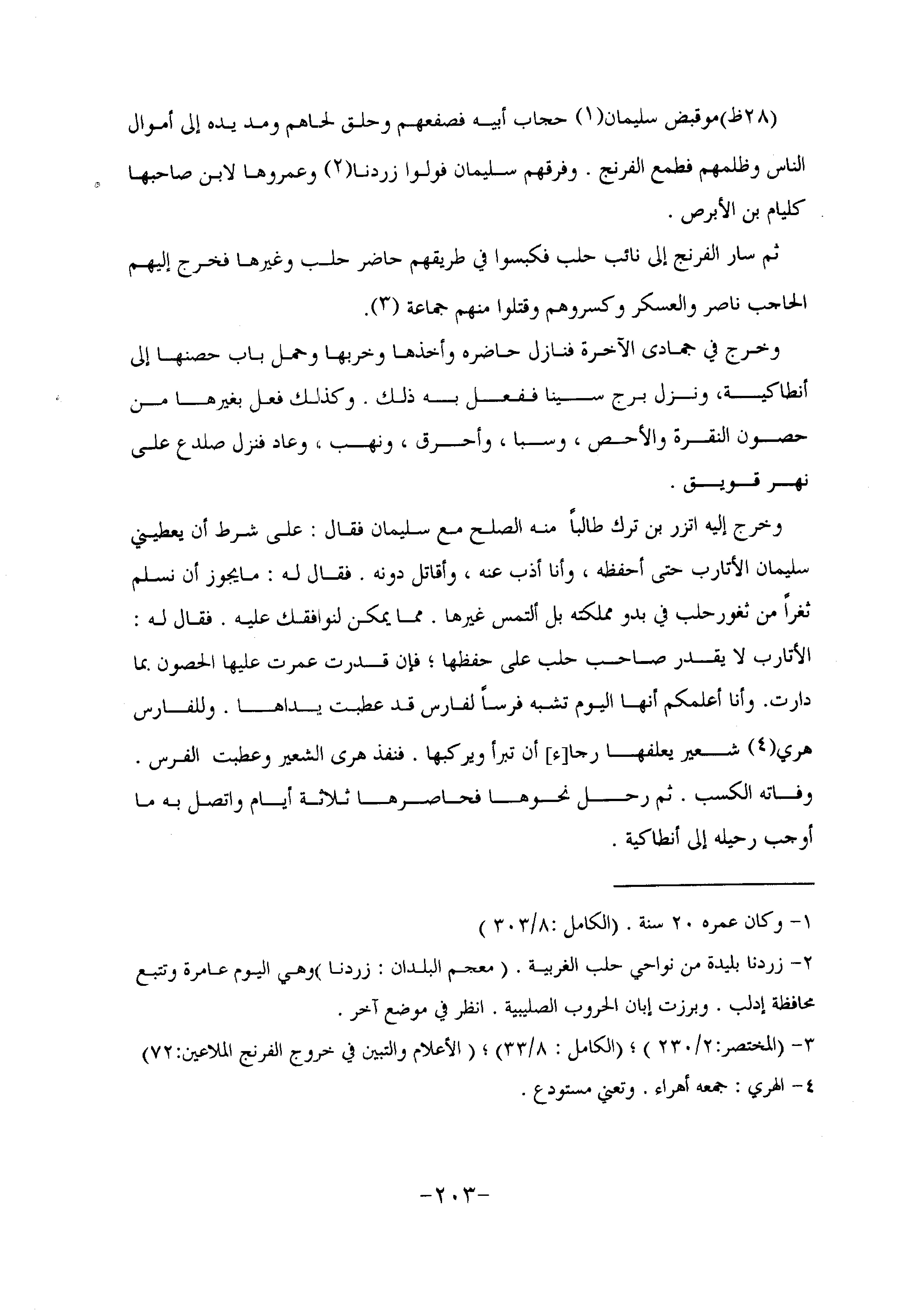 (28 ظ) موقبض سليمان «1» حجاب أبيه فصفعهم وحلق لحاهم ومد يده إلى أموال الناس وظلمهم فطمع الفرنج. وفرقهم سليمان فولوا زردنا «2» وعمروها لابن صاحبها كليام بن الأبرص.