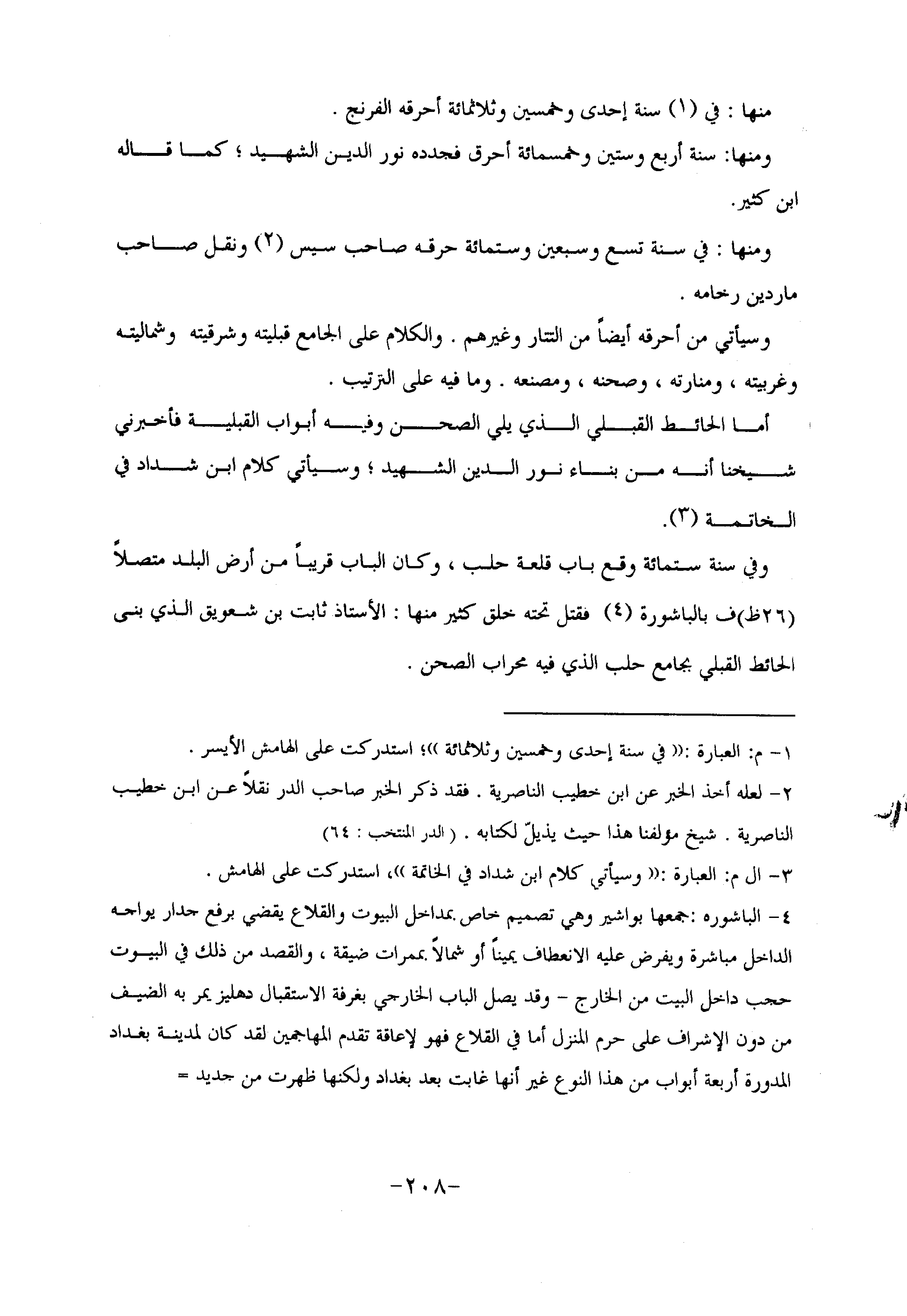 وفي سنة ستمائة وقع باب قلعة حلب، وكان الباب قريبا من أرض البلد متصلا (26 ظ) ف بالباشورة «4» فقتل تحته خلق كثير منها: الأستاذ ثابت بن شعويق الذي بنى الحائط القبلي بجامع حلب الذي فيه محراب الصحن.