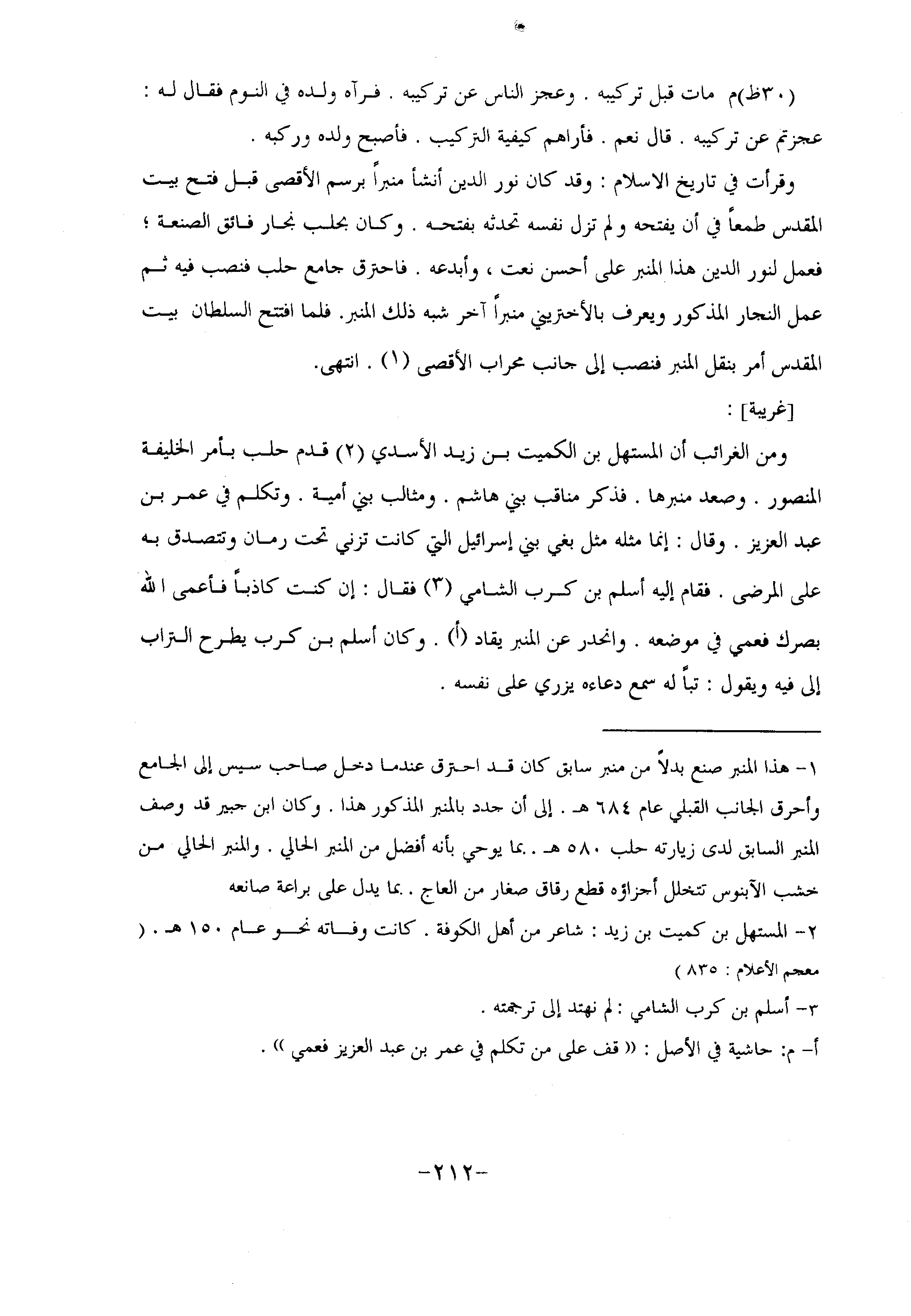 ومن الغرائب أن المستهل بن الكميت بن زيد الأسدي «2» قدم حلب بأمر الخليفة المنصور. وصعد منبرها. فذكر مناقب بني هاشم. ومثالب بني أمية. وتكلم في عمر بن عبد العزيز. وقال: إنما مثله مثل بغي بني إسرائيل التي كانت تزني تحت رمان وتتصدق به على المرضى. فقام إليه أسلم بن كرب الشامي «3» فقال: إن كنت كاذبا فأعمى الله بصرك فعمي في موضعه. وانحدر عن المنبر يقاد أ. وكان أسلم بن كرب يطرح التراب إلى فيه ويقول: تبا له سمع دعاءه يزري على نفسه.