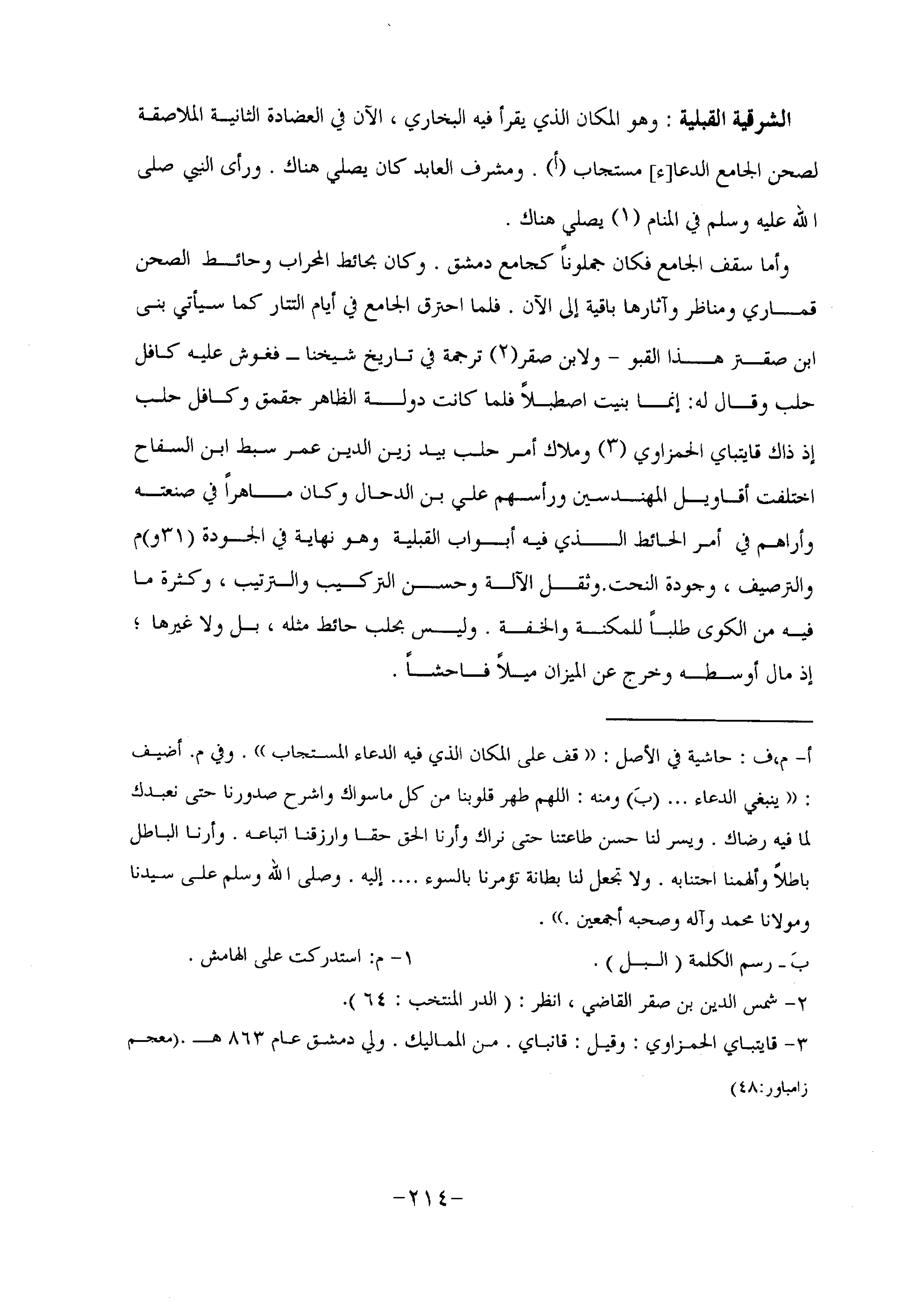 وهو المكان الذي يقرأ فيه البخاري، الآن في العضادة الثانية الملاصقة لصحن الجامع الدعا [ء] مستجاب أ. ومشرف العابد كان يصلي هناك. ورأى النبي صلى الله عليه وسلم في المنام «1» يصلي هناك.