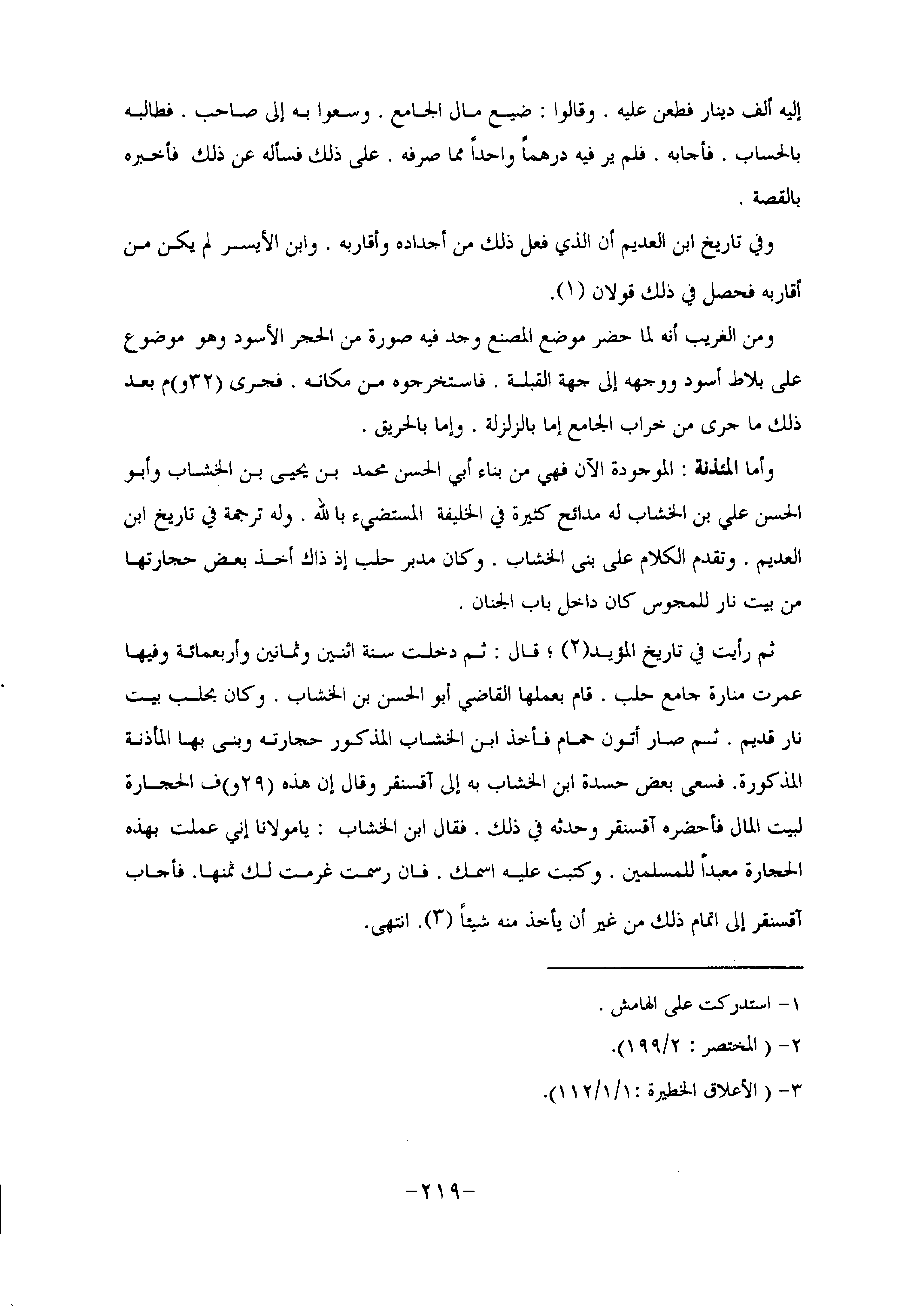 ثم رأيت في تاريخ المؤيد «2» ؛ قال: ثم دخلت سنة اثنين وثمانين وأربعمائة وفيها عمرت منارة جامع حلب. قام بعملها القاضي أبو الحسن بن الخشاب. وكان بحلب بيت نار قديم. ثم صار أتون حمام فأخذ ابن الخشاب المذكور حجارته وبنى بها المأذنة المذكورة. فسعى بعض حسدة ابن الخشاب به إلى آقسنقر وقال إن هذه (29 و) ف الحجارة لبيت المال فأحضره آقسنقر وحدثه في ذلك. فقال ابن الخشاب: يا مولانا إني عملت بهذه الحجارة معبدا للمسلمين. وكتبت عليه اسمك. فان رسمت غرمت لك ثمنها. فأجاب آقسنقر إلى اتمام ذلك من غير أن يأخذ منه شيئا «3» . انتهى.