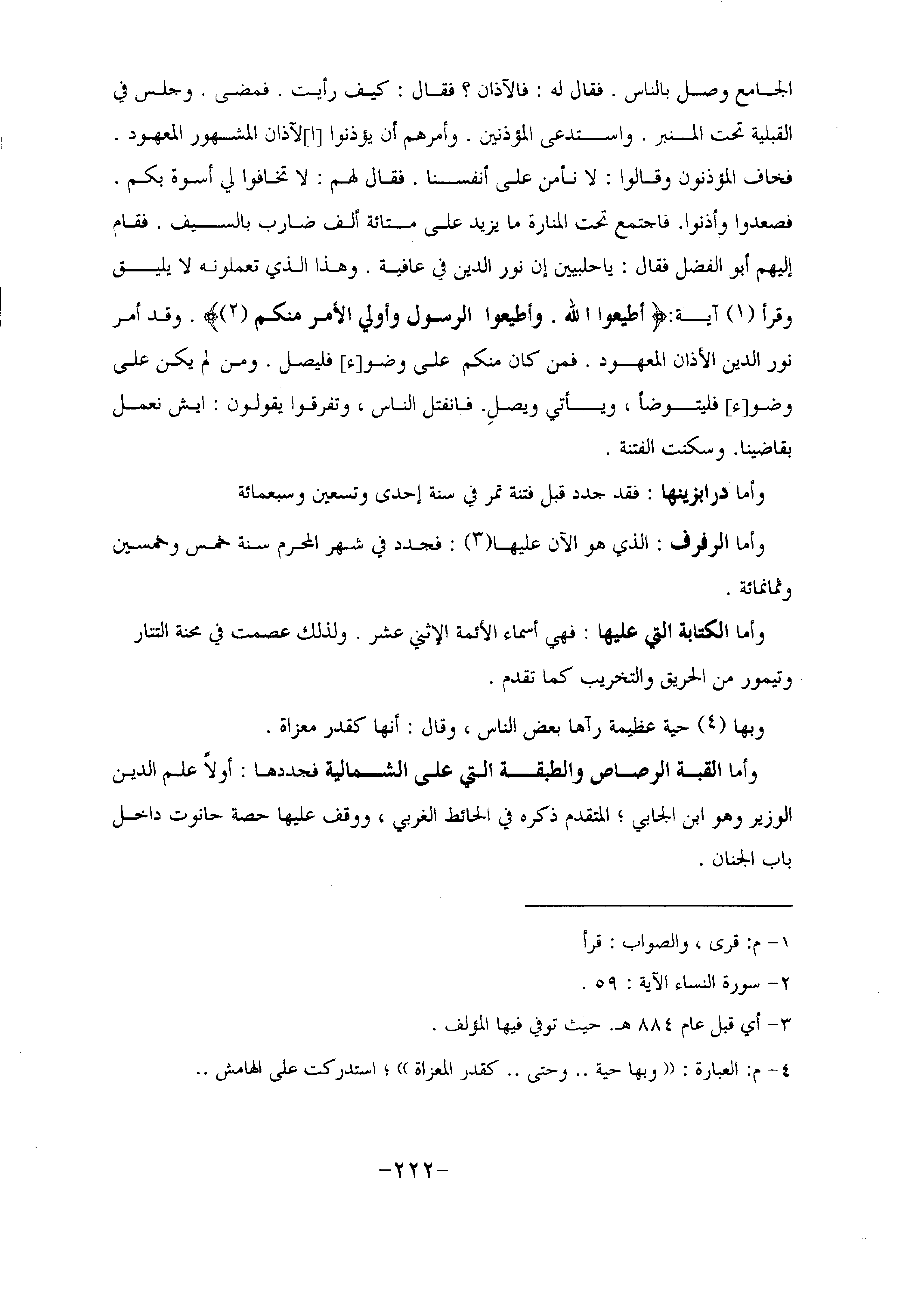 . وقد أمر نور الدين الأذان المعهود. فمن كان منكم على وضو [ء] فليصل. ومن لم يكن على وضو [ء] فليتوضأ، ويأتي ويصل. فانفتل الناس، وتفرقوا يقولون: ايش نعمل بقاضينا. وسكنت الفتنة.