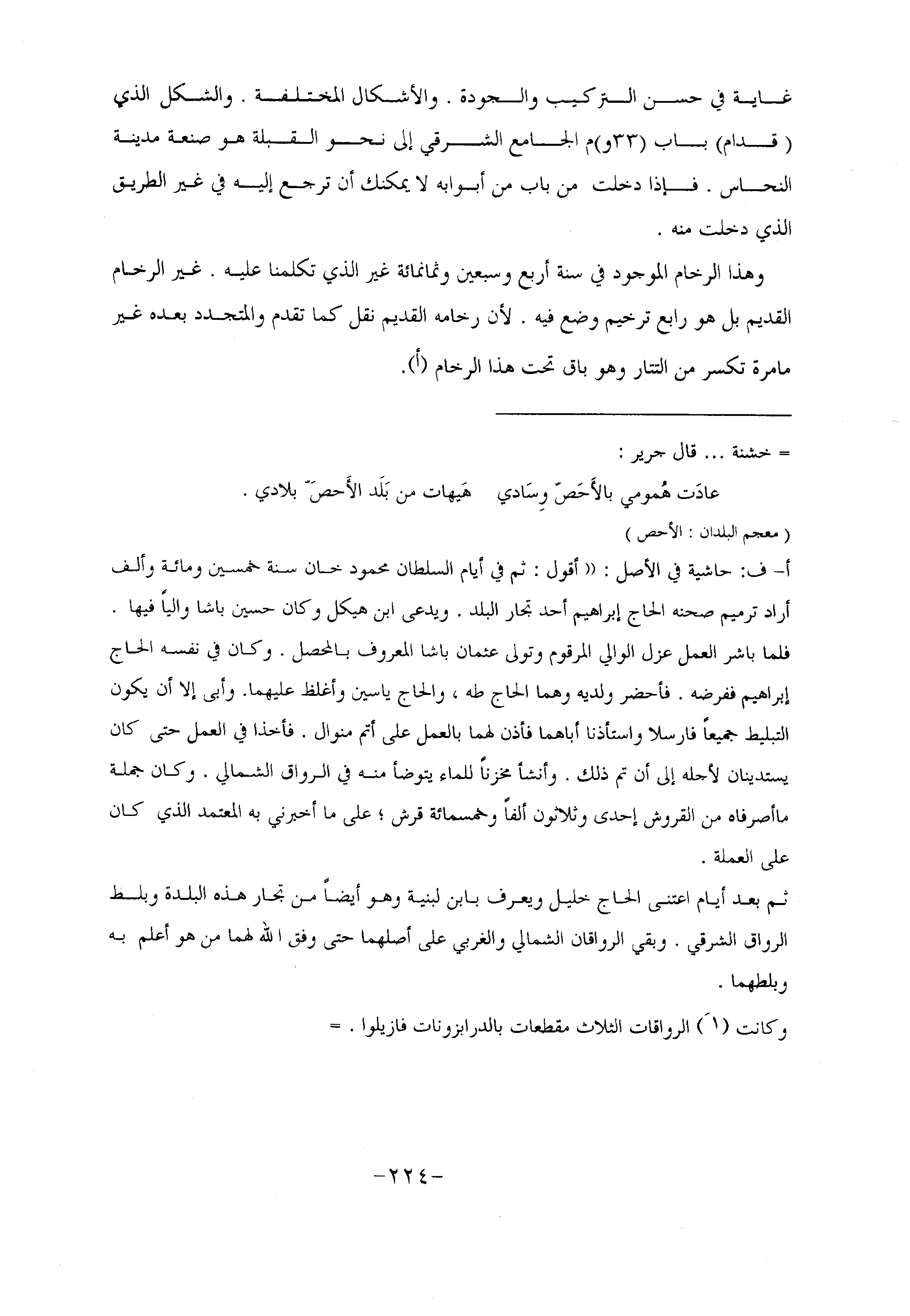 غاية في حسن التركيب والجودة. والأشكال المختلفة. والشكل الذي (قدام) باب (33 و) م الجامع الشرقي إلى نحو القبلة هو صنعة مدينة النحاس. فإذا دخلت من باب من أبوابه لا يمكنك أن ترجع إليه في غير الطريق الذي دخلت منه.