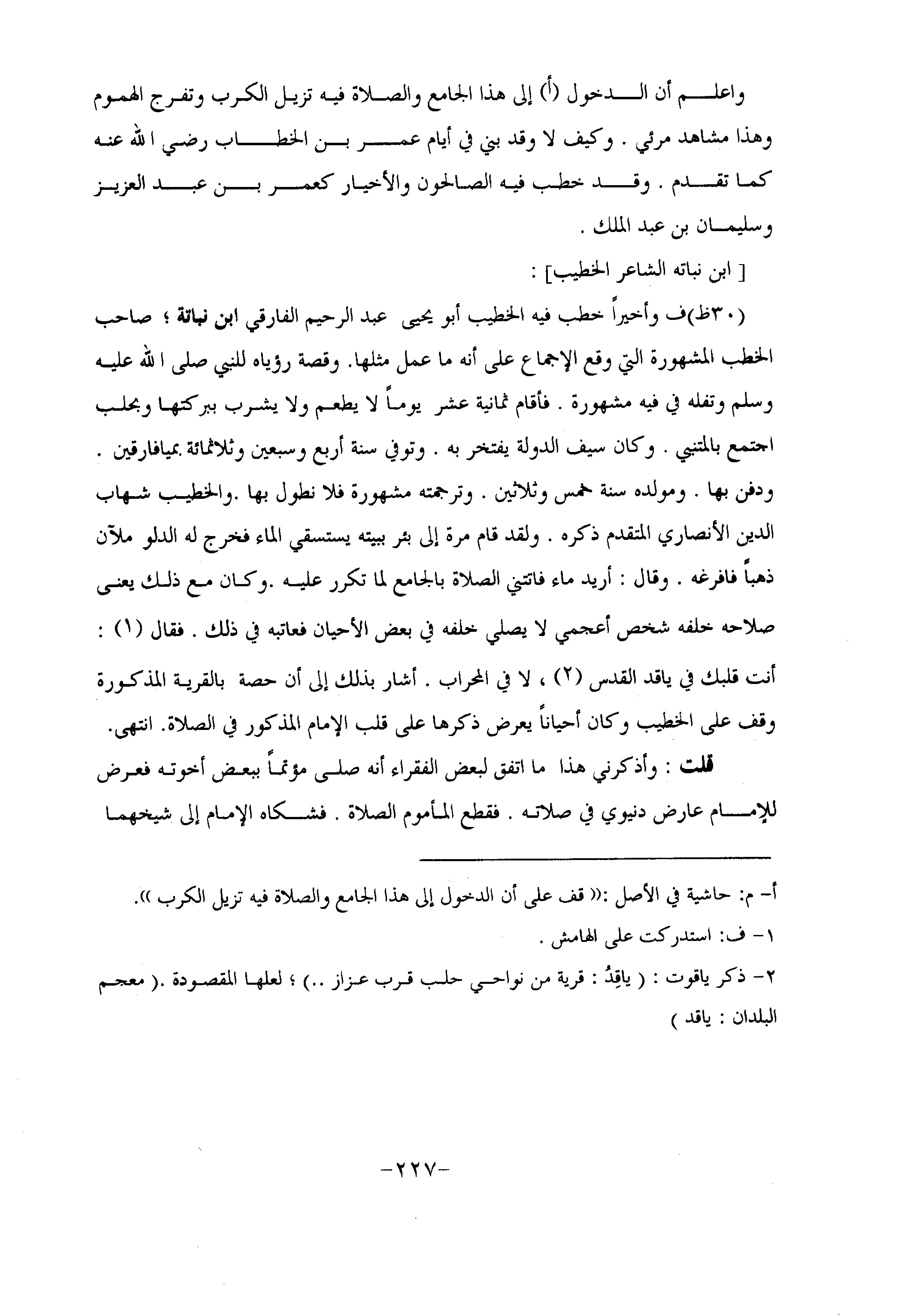 (30 ظ) ف وأخيرا خطب فيه الخطيب أبو يحيى عبد الرحيم الفارقي ابن نباتة؛ صاحب الخطب المشهورة التي وقع الإجماع على أنه ما عمل مثلها. وقصة رؤياه للنبي صلى الله عليه وسلم وتفله في فيه مشهورة. فأقام ثمانية عشر يوما لا يطعم ولا يشرب ببركتها وبحلب اجتمع بالمتنبي. وكان سيف الدولة يفتخر به. وتوفي سنة أربع وسبعين وثلاثمائة بميافارقين.