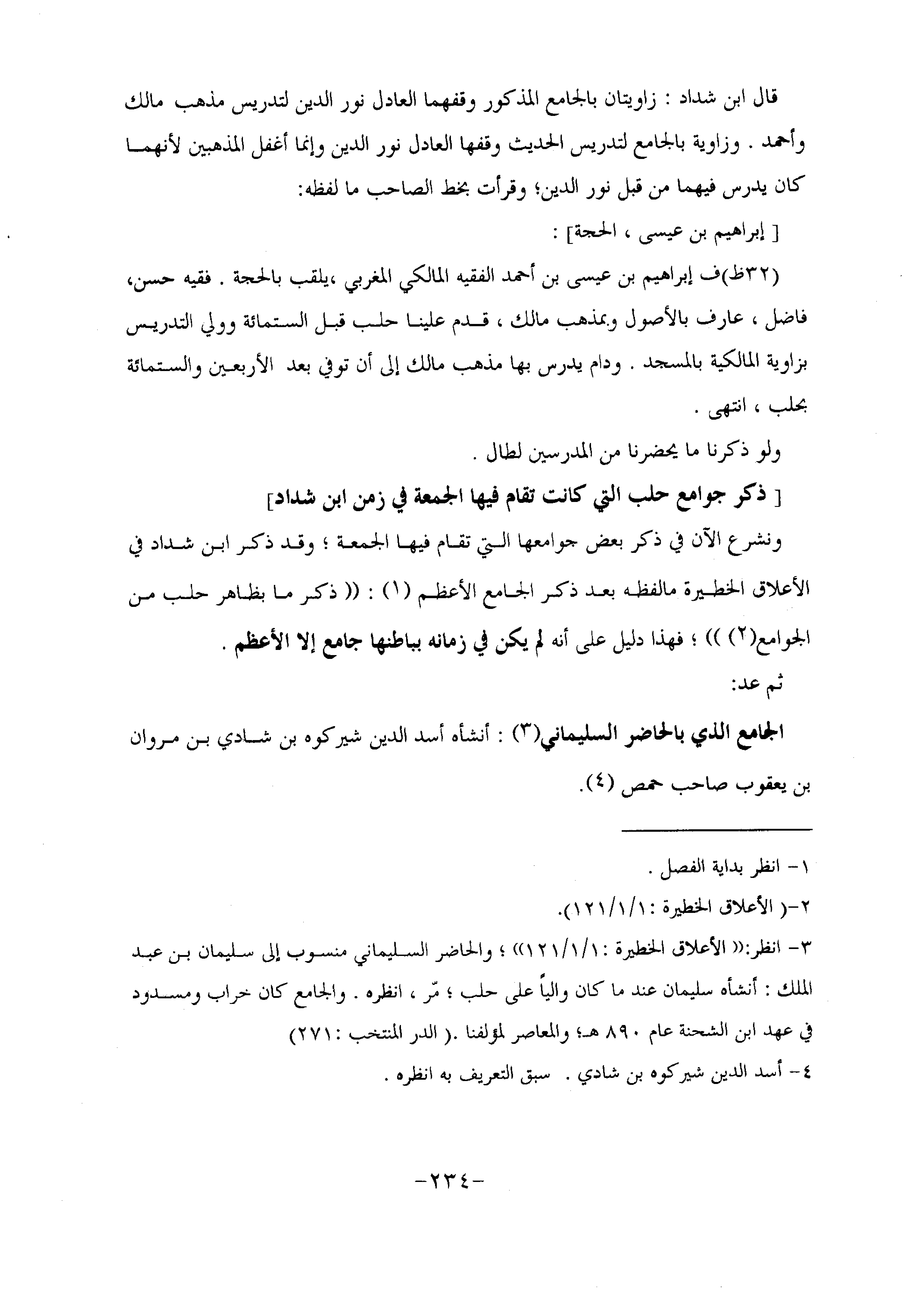 ونشرع الآن في ذكر بعض جوامعها التي تقام فيها الجمعة؛ وقد ذكر ابن شداد في الأعلاق الخطيرة ما لفظه بعد ذكر الجامع الأعظم «1» : «ذكر ما بظاهر حلب من الجوامع «2» » ؛ فهذا دليل على أنه لم يكن في زمانه بباطنها جامع إلا الأعظم.