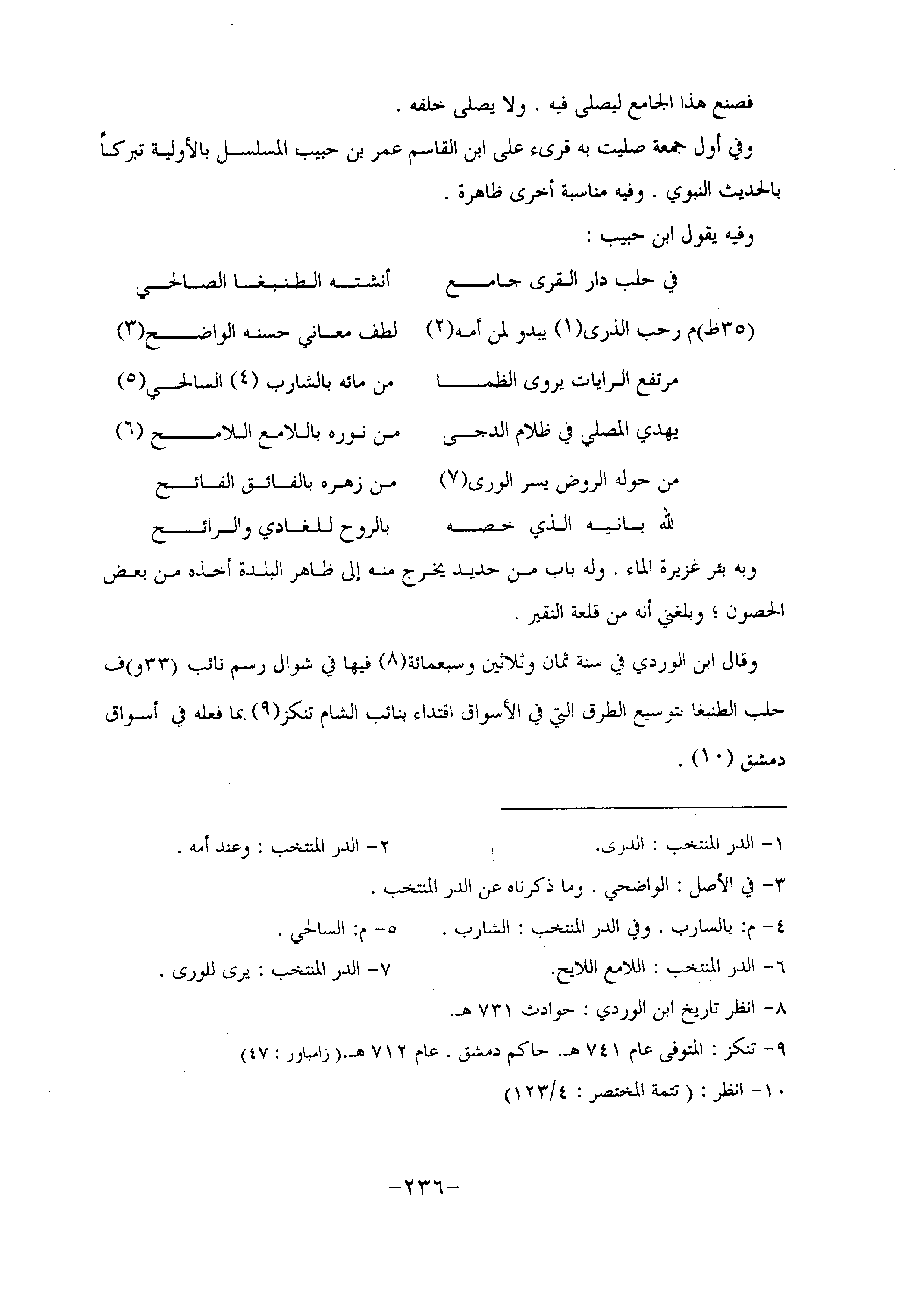 وقال ابن الوردي في سنة ثمان وثلاثين وسبعمائة «8» فيها في شوال رسم نائب (33 و) ف حلب الطنبغا بتوسيع الطرق التي في الأسواق اقتداء بنائب الشام تنكز «9» بما فعله في أسواق دمشق «10» .