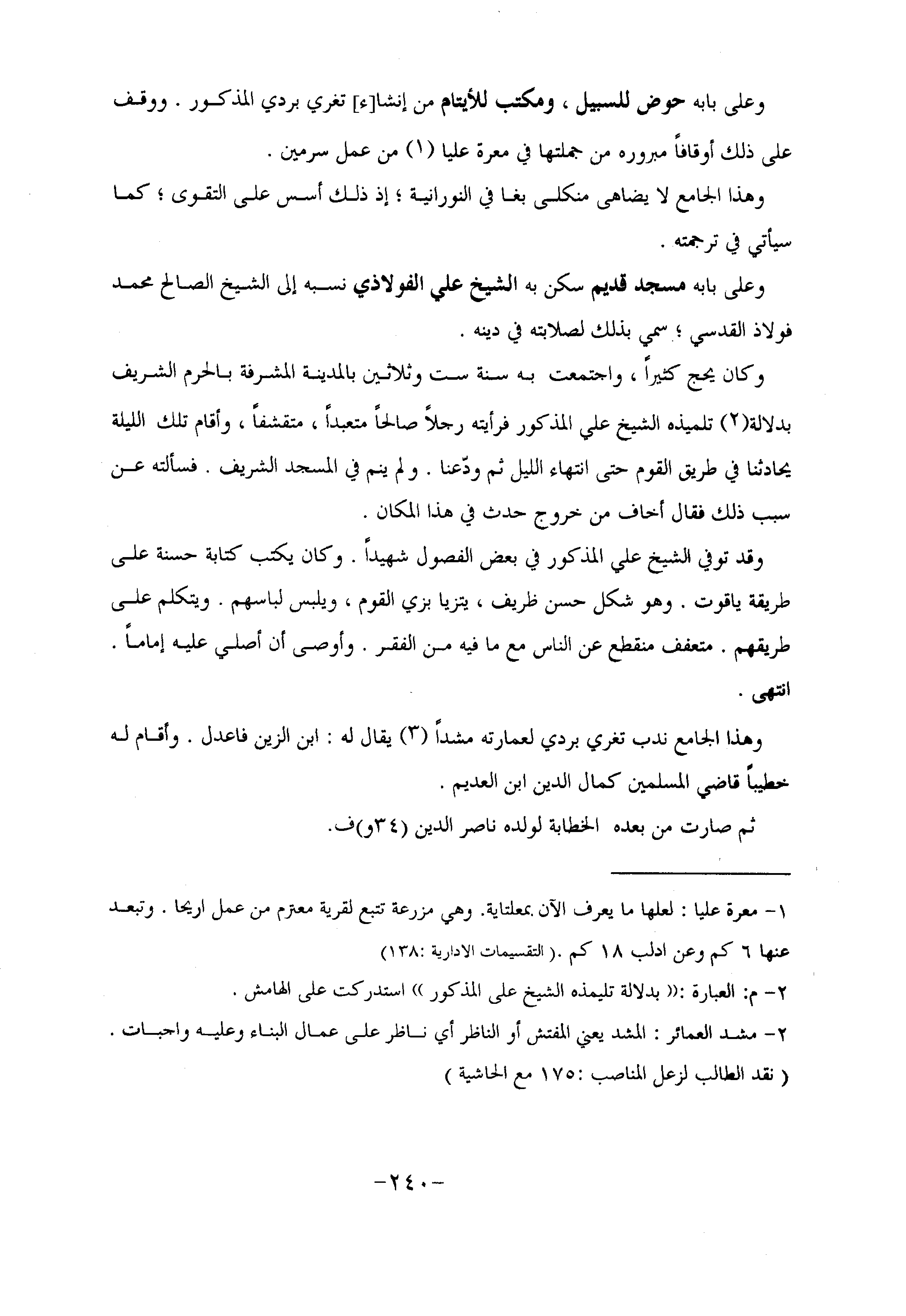 وعلى بابه حوض للسبيل، ومكتب للأيتام من إنشا [ء] تغري بردي المذكور. ووقف على ذلك أوقافا مبروره من جملتها في معرة عليا «1» من عمل سرمين.