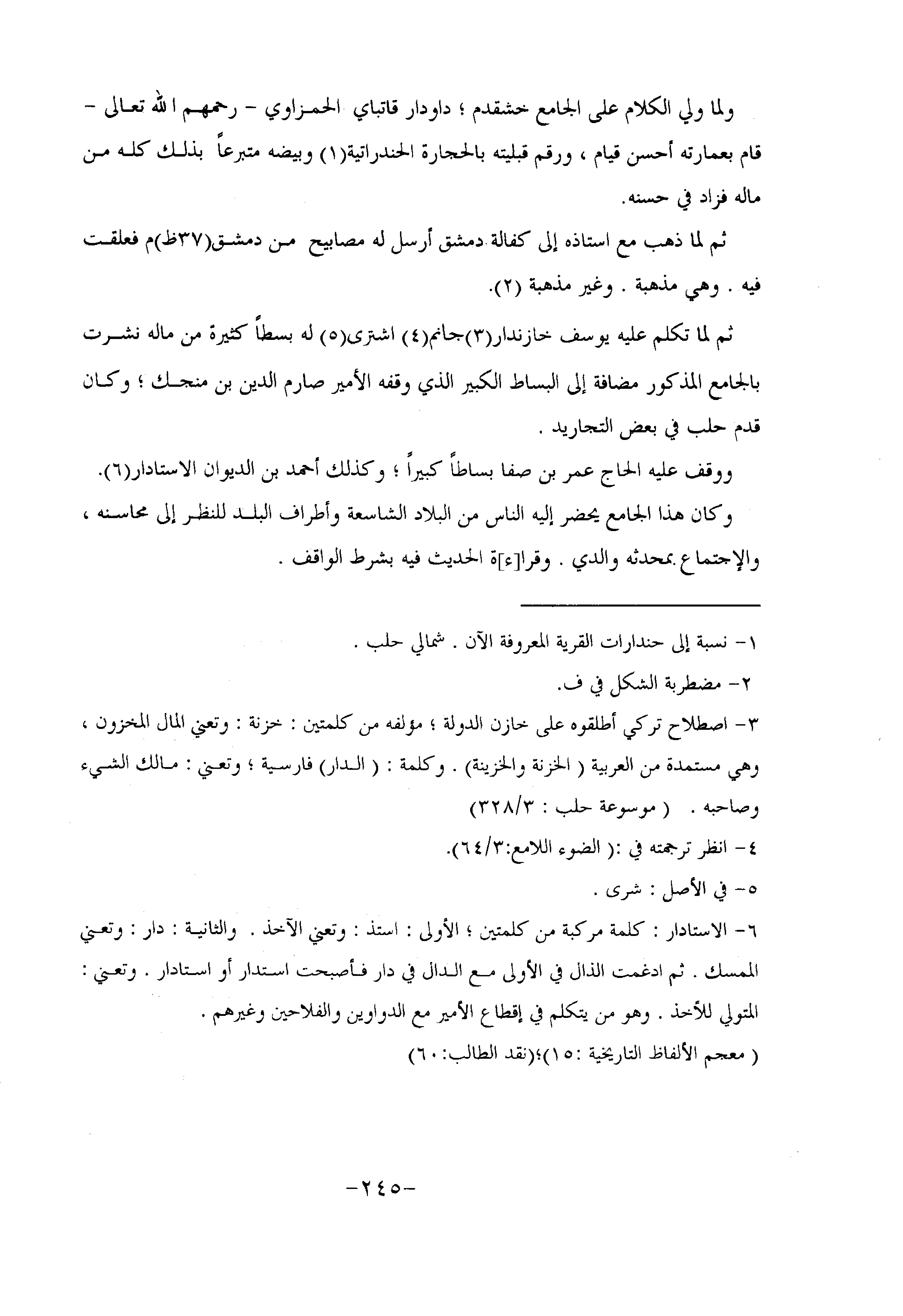 ثم لما تكلم عليه يوسف خازندار «3» جانم «4» اشترى «5» له بسطا كثيرة من ماله نشرت بالجامع المذكور مضافة إلى البساط الكبير الذي وقفه الأمير صارم الدين بن منجك؛ وكان قدم حلب في بعض التجاريد.
