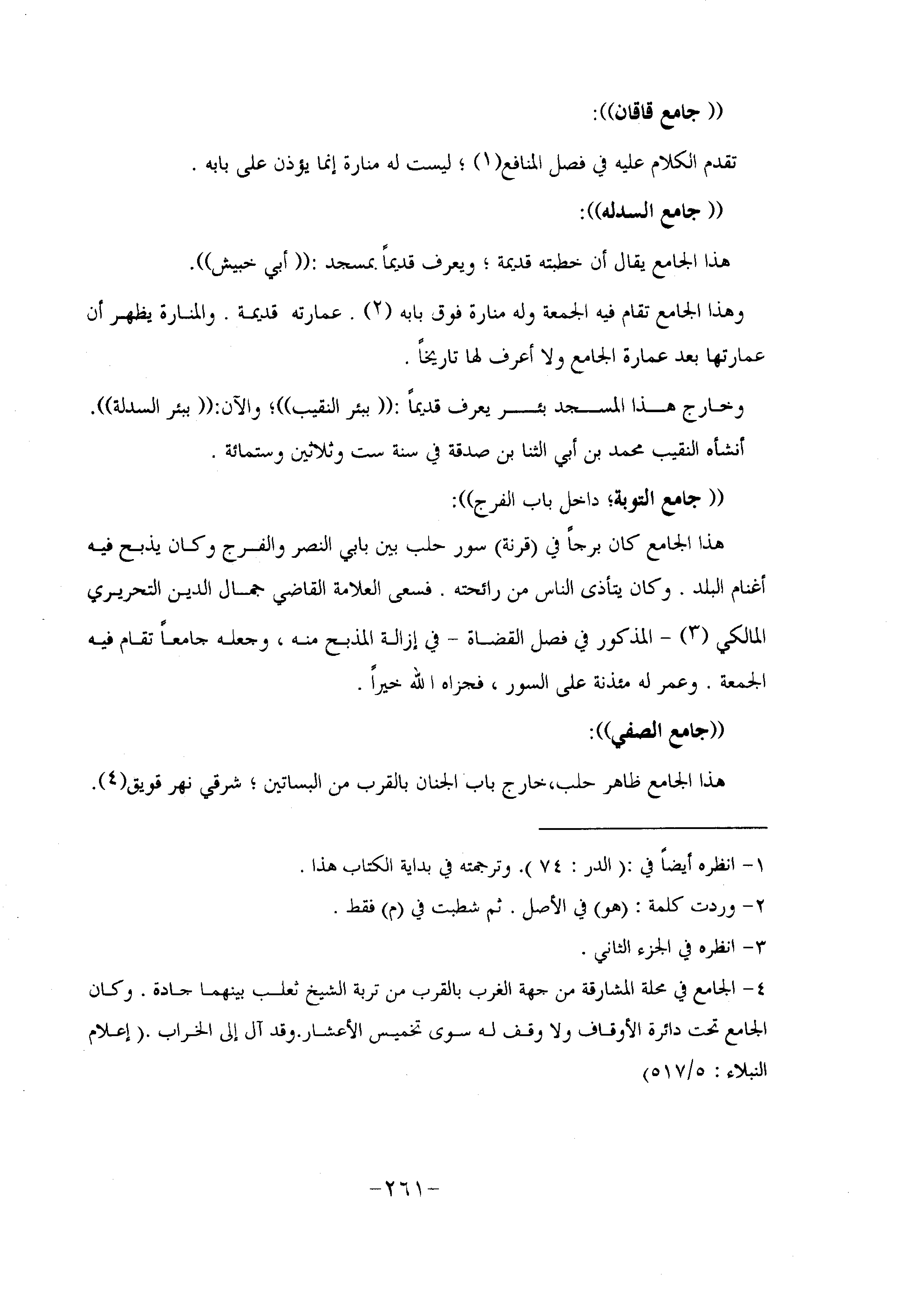 هذا الجامع كان برجا في (قرنة) سور حلب بين بابي النصر والفرج وكان يذبح فيه أغنام البلد. وكان يتأذى الناس من رائحته. فسعى العلامة القاضي جمال الدين التحريري المالكي «3» - المذكور في فصل القضاة- في إزالة المذبح منه، وجعله جامعا تقام فيه الجمعة. وعمر له مئذنة على السور، فجزاه الله خيرا.