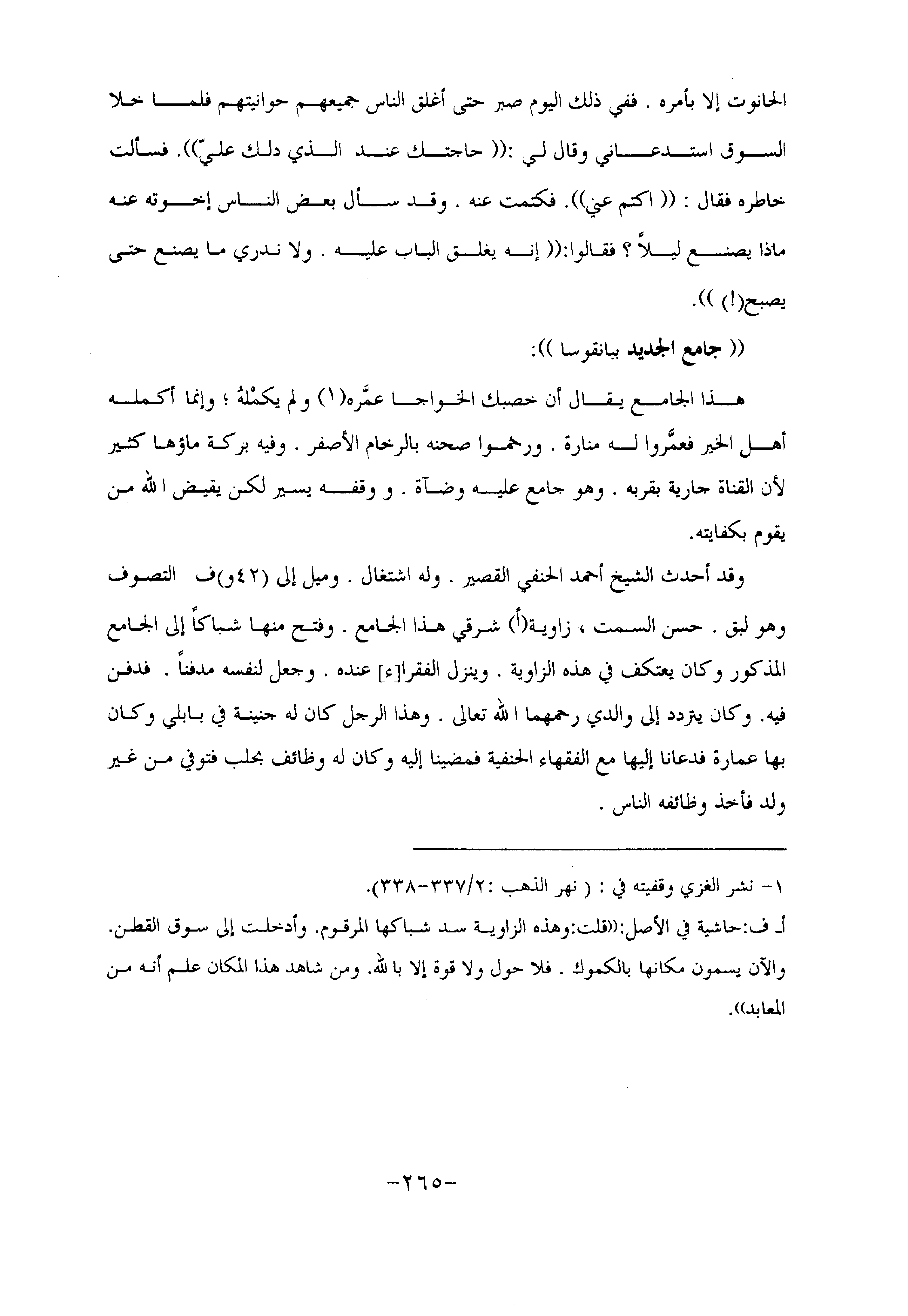 وقد أحدث الشيخ أحمد الحنفي القصير. وله اشتغال. وميل إلى (42 و) ف التصوف وهو لبق. حسن السمت، زاوية أشرقي هذا الجامع. وفتح منها شباكا إلى الجامع المذكور وكان يعتكف في هذه الزاوية. وينزل الفقرا [ء] عنده. وجعل لنفسه مدفنا. فدفن فيه. وكان يتردد إلى والدي رحمهما الله تعالى. وهذا الرجل كان له جنينة في بابلي وكان بها عمارة فدعانا إليها مع الفقهاء الحنفية فمضينا إليه وكان له وظائف بحلب فتوفي من غير ولد فأخذ وظائفه الناس.