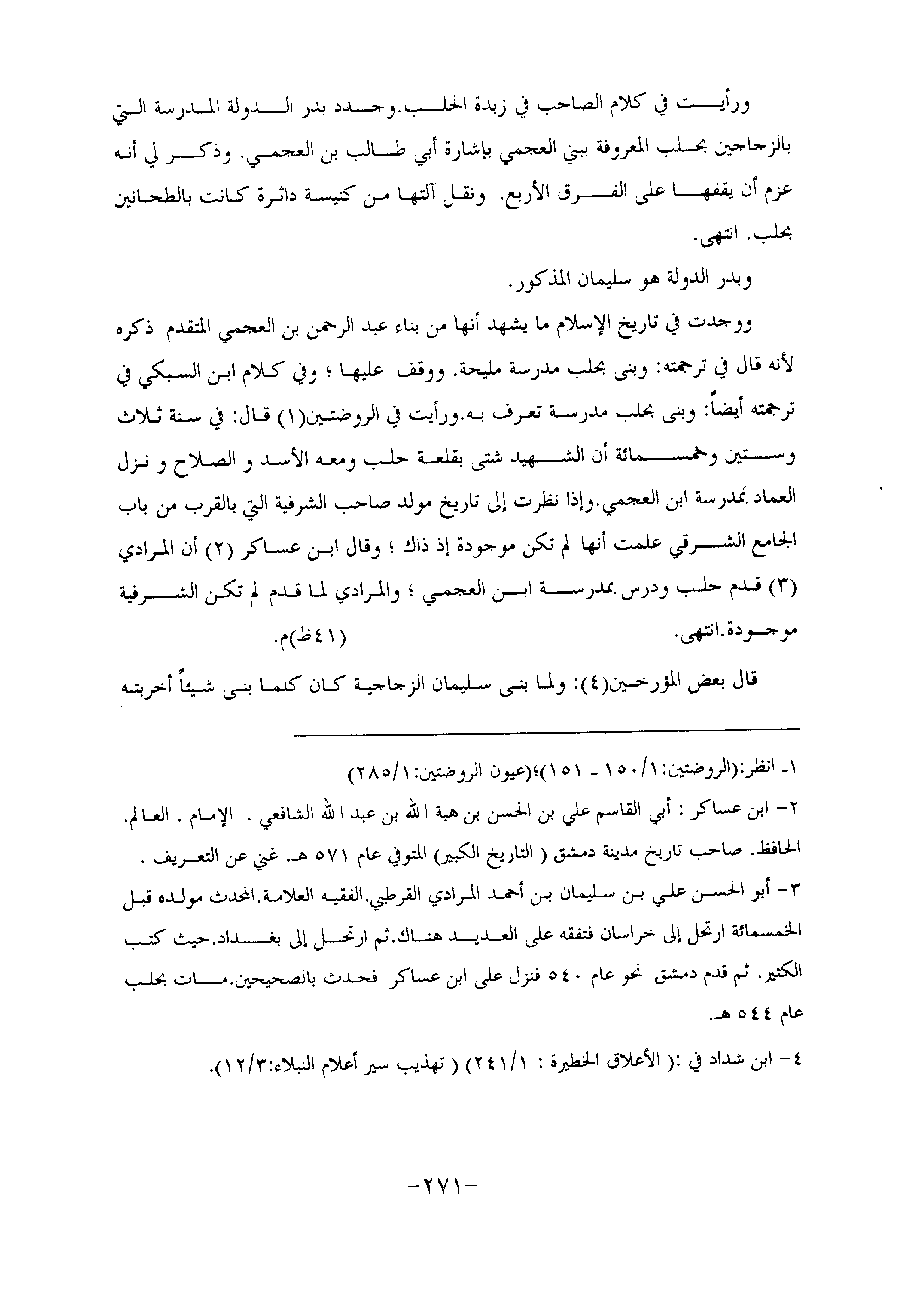 ورأيت في كلام الصاحب في زبدة الحلب. وجدد بدر الدولة المدرسة التي بالزجاجين بحلب المعروفة ببني العجمي بإشارة أبي طالب بن العجمي. وذكر لي أنه عزم أن يقفها على الفرق الأربع. ونقل آلتها من كنيسة داثرة كانت بالطحانين بحلب. انتهى.