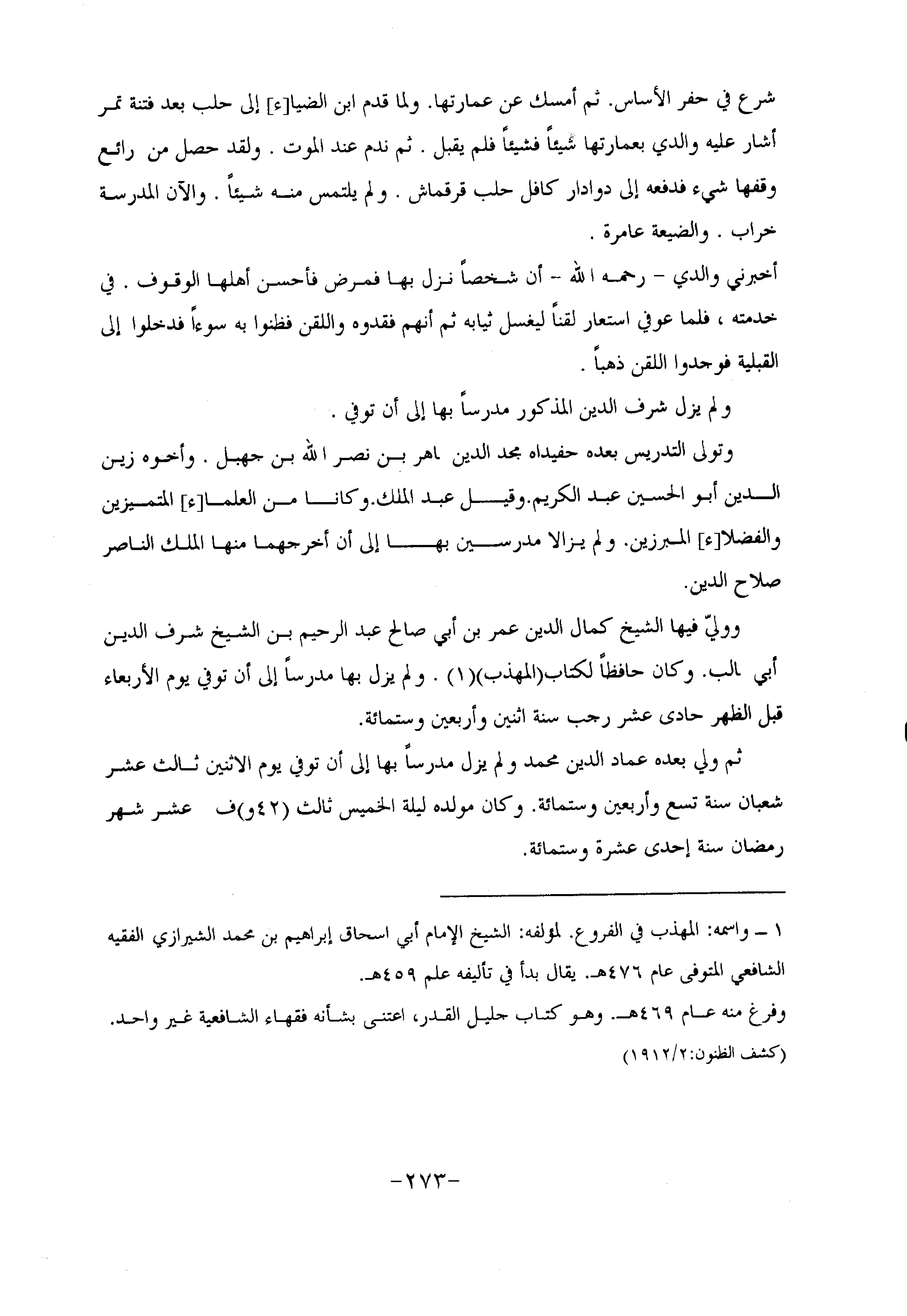 شرع في حفر الأساس. ثم أمسك عن عمارتها. ولما قدم ابن الضيا [ء] إلى حلب بعد فتنة تمر أشار عليه والدي بعمارتها شيئا فشيئا فلم يقبل. ثم ندم عند الموت. ولقد حصل من رائع وقفها شيء فدفعه إلى دوادار كافل حلب قرقماش. ولم يلتمس منه شيئا. والآن المدرسة خراب. والضيعة عامرة.