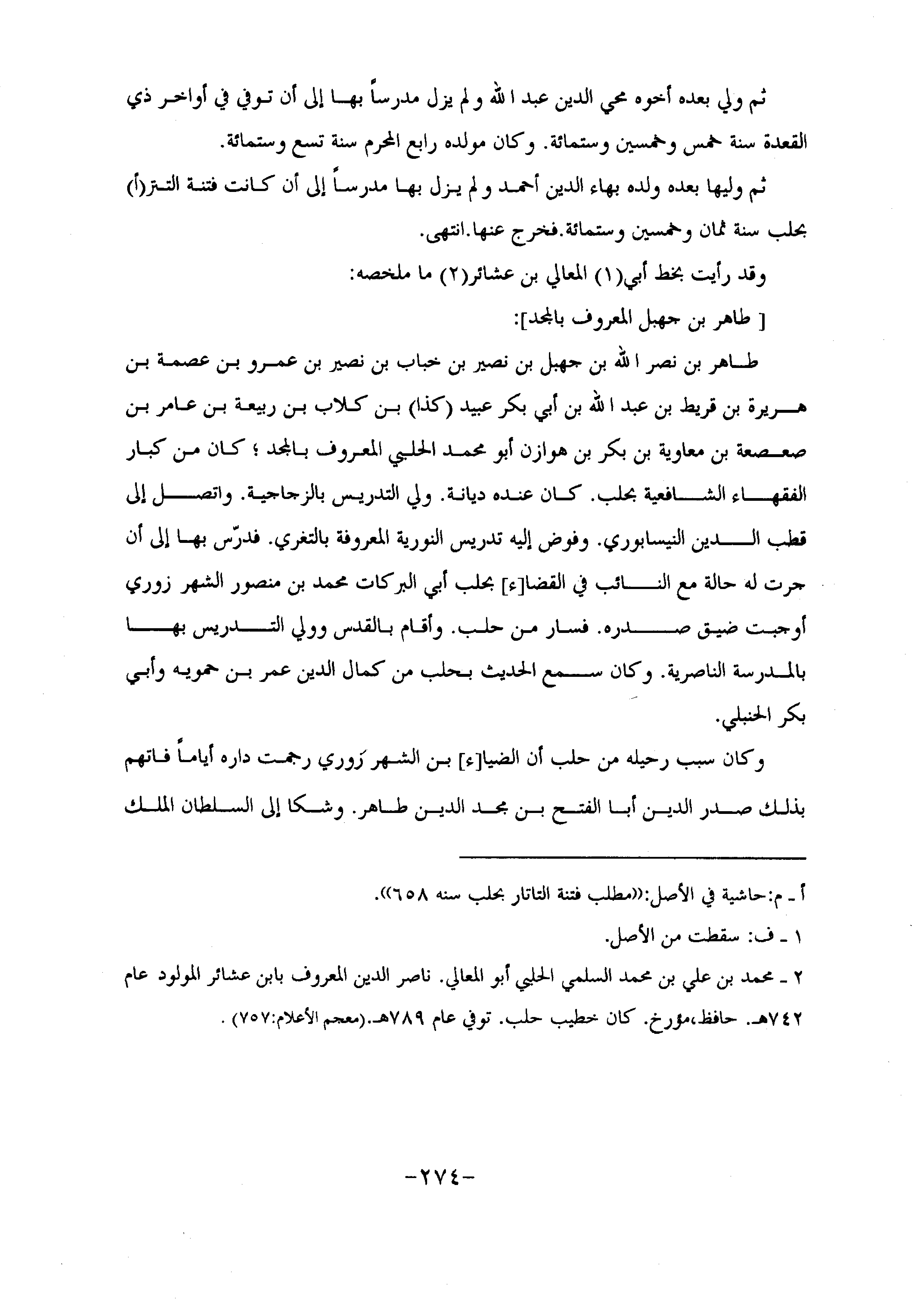 طاهر بن نصر الله بن جهبل بن نصير بن خباب بن نصير بن عمرو بن عصمة بن هريرة بن قريط بن عبد الله بن أبي بكر عبيد (كذا) بن كلاب بن ربيعة بن عامر بن صعصعة بن معاوية بن بكر بن هوازن أبو محمد الحلبي المعروف بالمجد؛ كان من كبار الفقهاء الشافعية بحلب. كان عنده ديانة. ولي التدريس بالزجاجية. واتصل إلى قطب الدين النيسابوري. وفوض إليه تدريس النورية المعروفة بالتغري. فدرّس بها إلى أن جرت له حالة مع النائب في القضا [ء] بحلب أبي البركات محمد بن منصور الشهر زوري أوجبت ضيق صدره. فسار من حلب. وأقام بالقدس وولي التدريس بها بالمدرسة الناصرية. وكان سمع الحديث بحلب من كمال الدين عمر بن حمويه وأبي بكر الحنبلي.