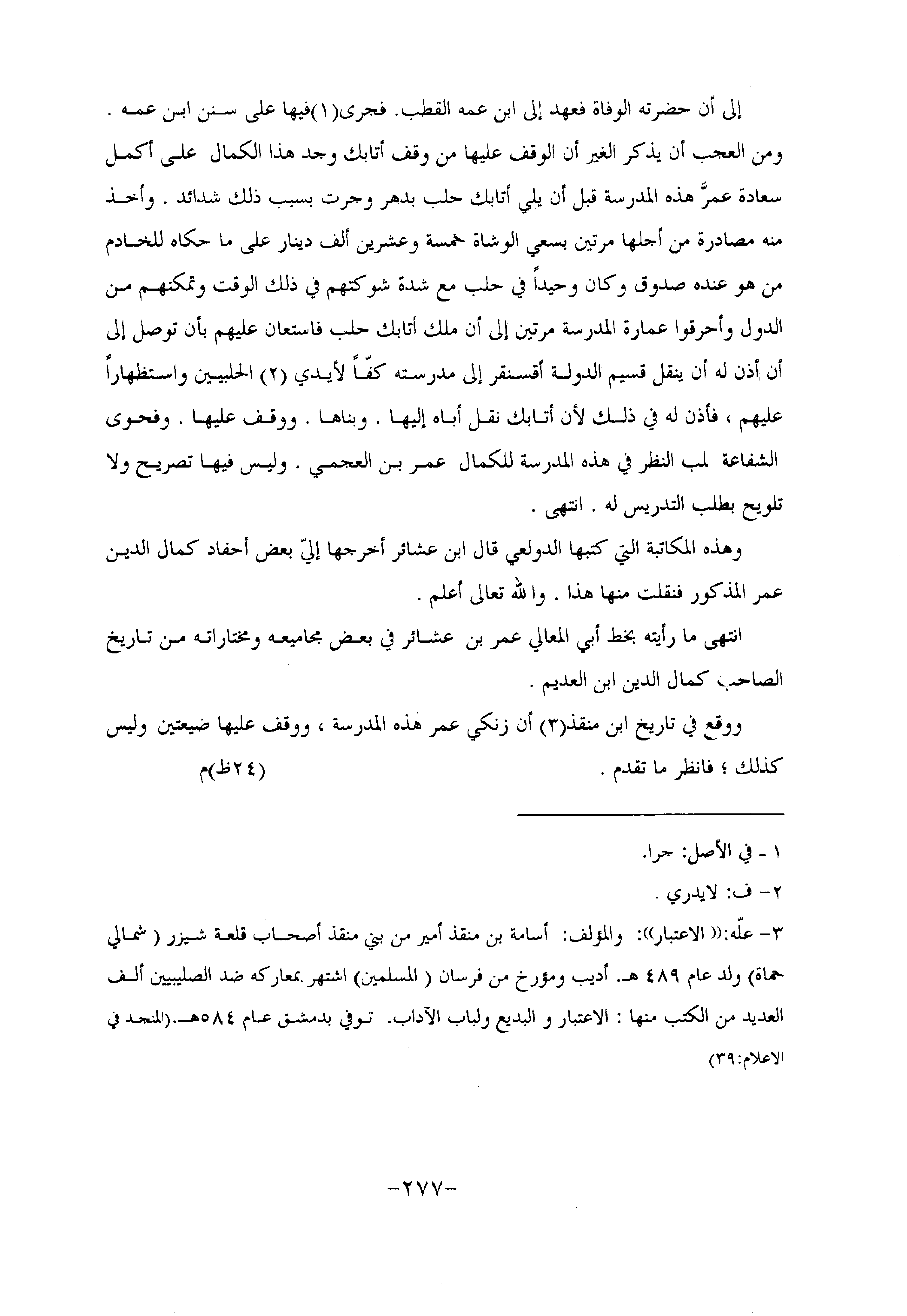 ووقع في تاريخ ابن منقذ «3» أن زنكي عمر هذه المدرسة، ووقف عليها ضيعتين وليس كذلك؛ فانظر ما تقدم. (24 ظ) م