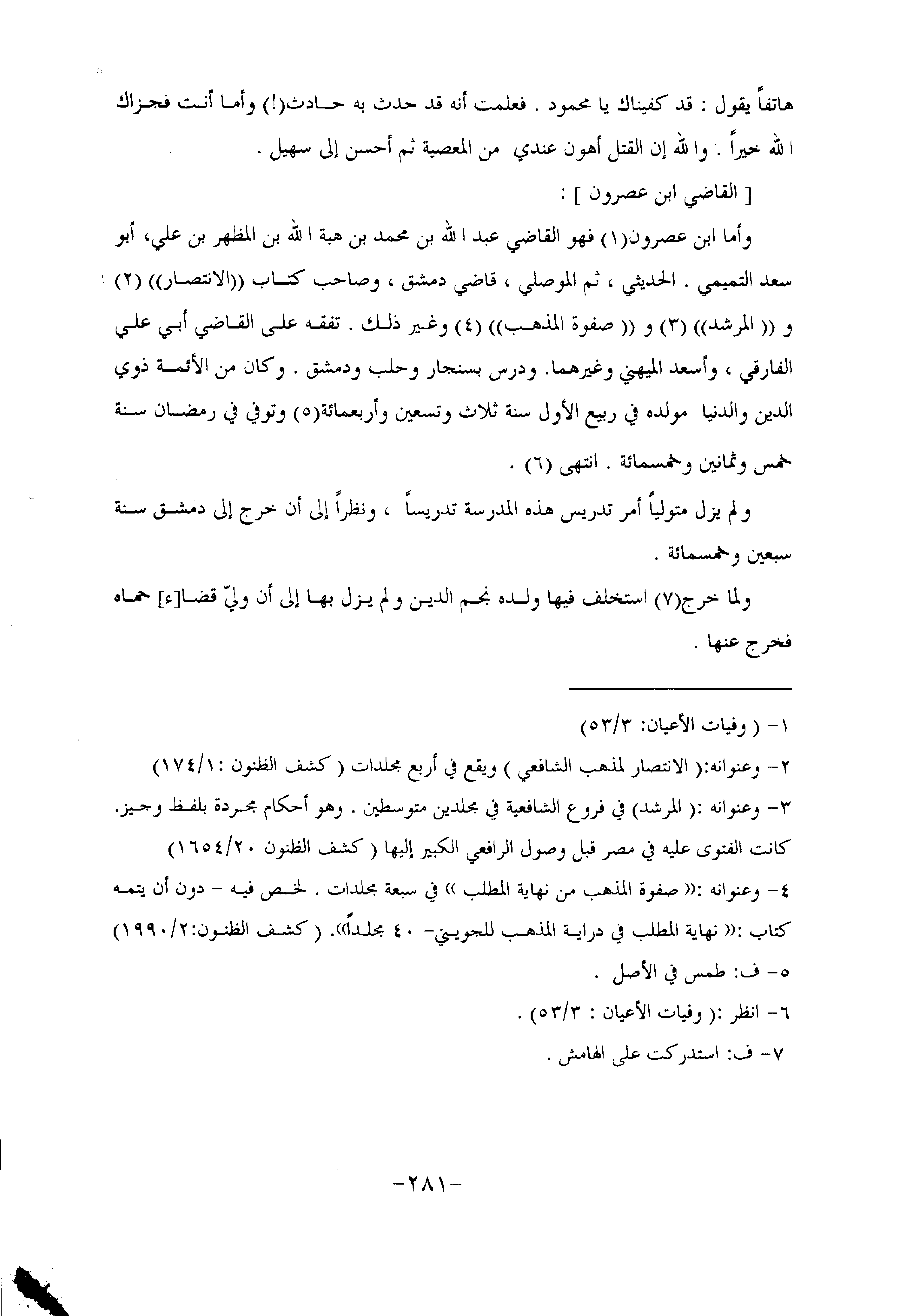 وأما ابن عصرون «1» فهو القاضي عبد الله بن محمد بن هبة الله بن المظهر بن علي، أبو سعد التميمي. الحديثي، ثم الموصلي، قاضي دمشق، وصاحب كتاب «الانتصار» «2» و «المرشد» «3» و «صفوة المذهب» «4» وغير ذلك. تفقه على القاضي أبي علي الفارقي، وأسعد الميهني وغيرهما. ودرس بسنجار وحلب ودمشق. وكان من الأئمة ذوي الدين والدنيا مولده في ربيع الأول سنة ثلاث وتسعين وأربعمائة «5» وتوفي في رمضان سنة خمس وثمانين وخمسمائة. انتهى «6» .