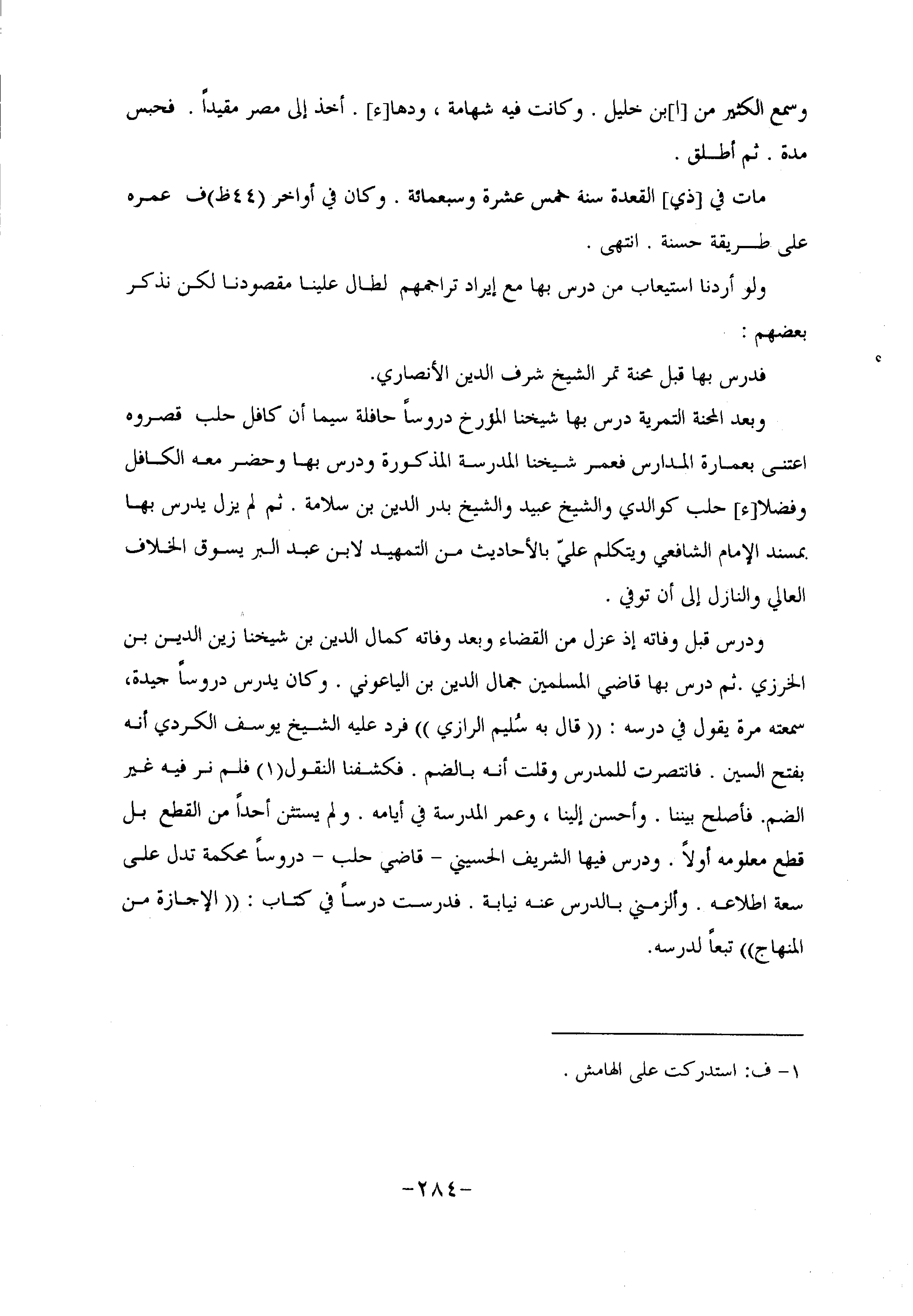 وبعد المحنة التمرية درس بها شيخنا المؤرخ دروسا حافلة سيما أن كافل حلب قصروه اعتنى بعمارة المدارس فعمر شيخنا المدرسة المذكورة ودرس بها وحضر معه الكافل وفضلا [ء] حلب كوالدي والشيخ عبيد والشيخ بدر الدين بن سلامة. ثم لم يزل يدرس بها بمسند الإمام الشافعي ويتكلم عليّ بالأحاديث من التمهيد لابن عبد البر يسوق الخلاف العالي والنازل إلى أن توفي.