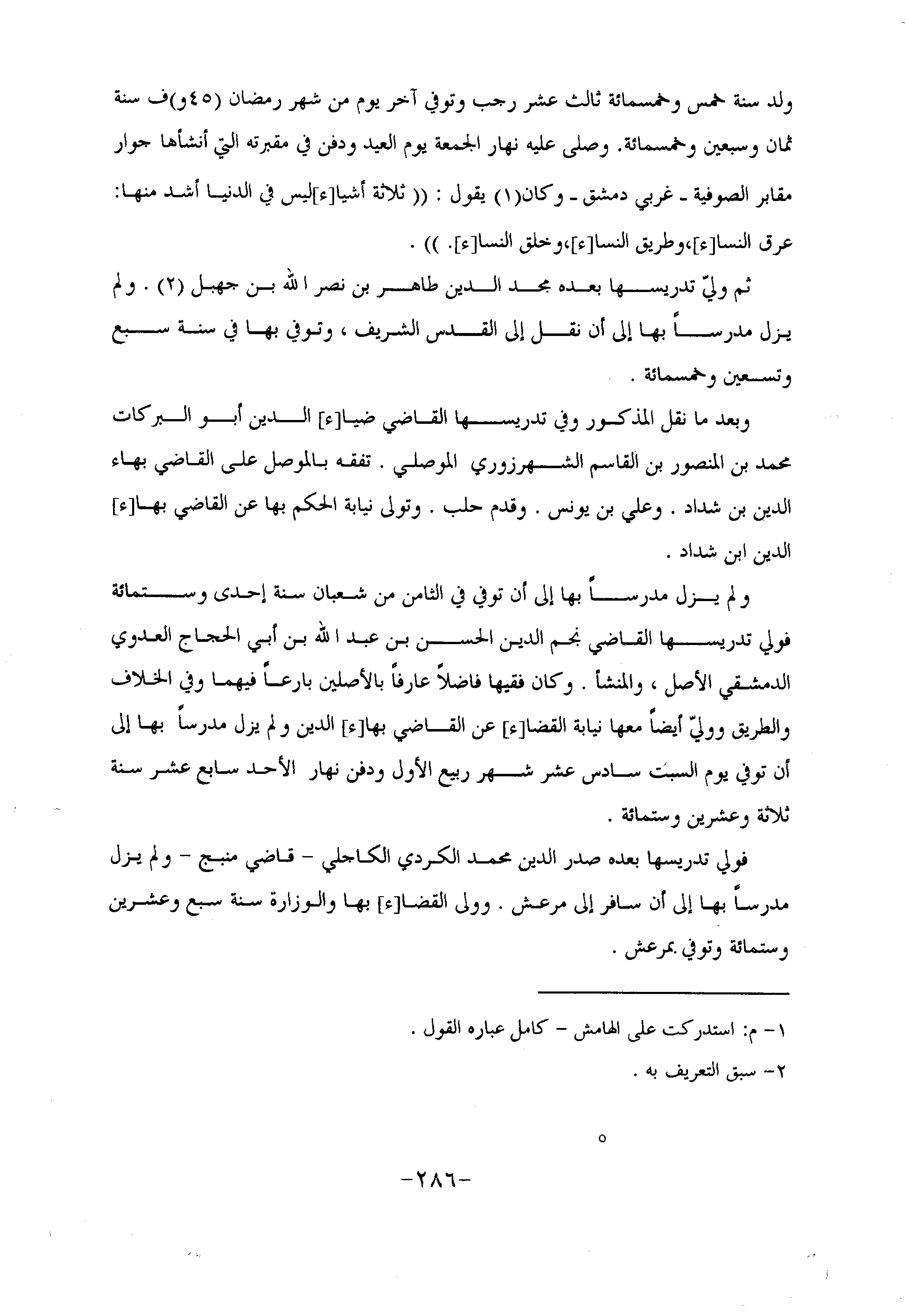 وبعد ما نقل المذكور وفي تدريسها القاضي ضيا [ء] الدين أبو البركات محمد بن المنصور بن القاسم الشهرزوري الموصلي. تفقه بالموصل على القاضي بهاء الدين بن شداد. وعلي بن يونس. وقدم حلب. وتولى نيابة الحكم بها عن القاضي بها [ء] الدين ابن شداد.