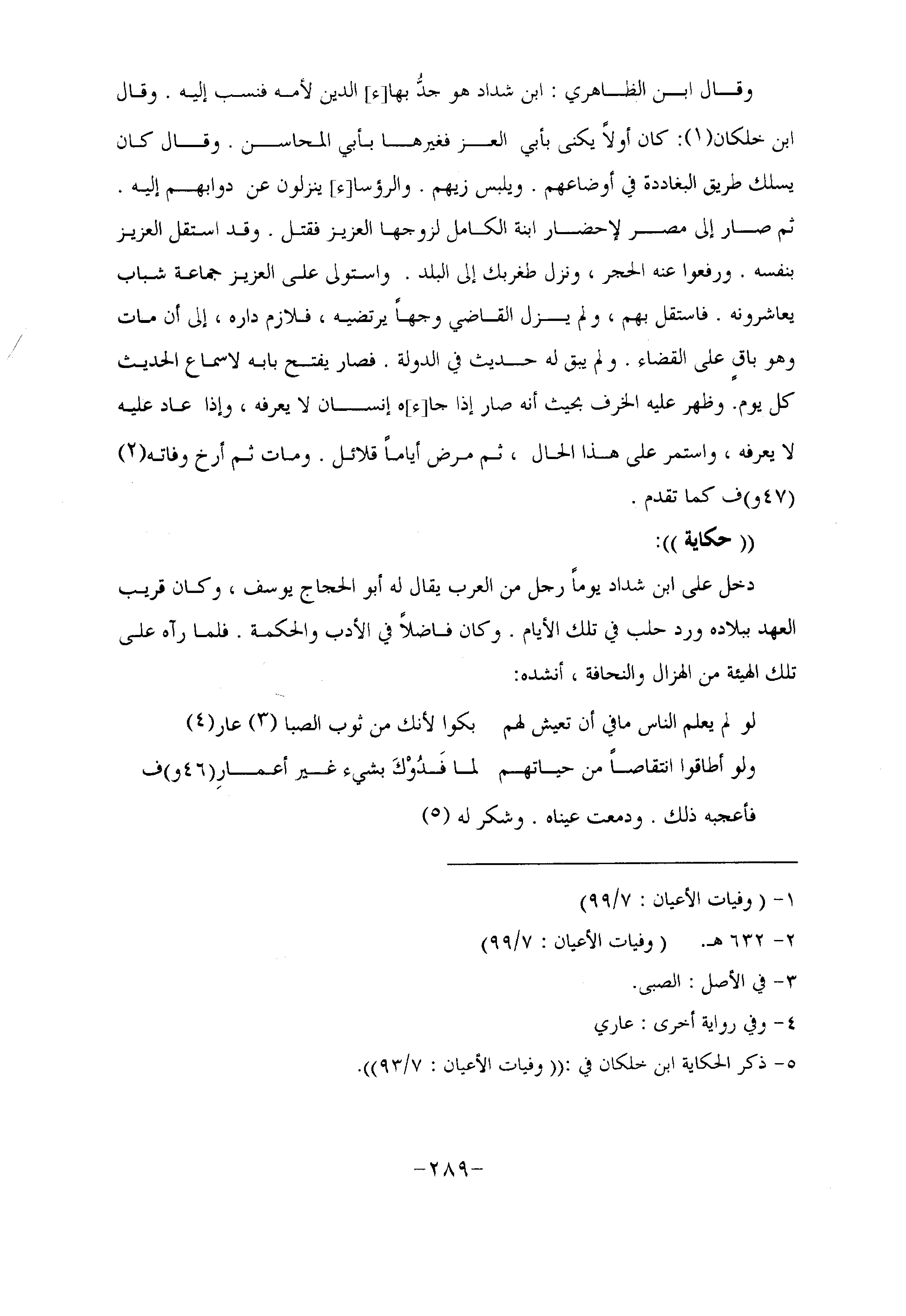 دخل على ابن شداد يوما رجل من العرب يقال له أبو الحجاج يوسف، وكان قريب العهد ببلاده ورد حلب في تلك الأيام. وكان فاضلا في الأدب والحكمة. فلما رآه على تلك الهيئة من الهزال والنحافة، أنشده: