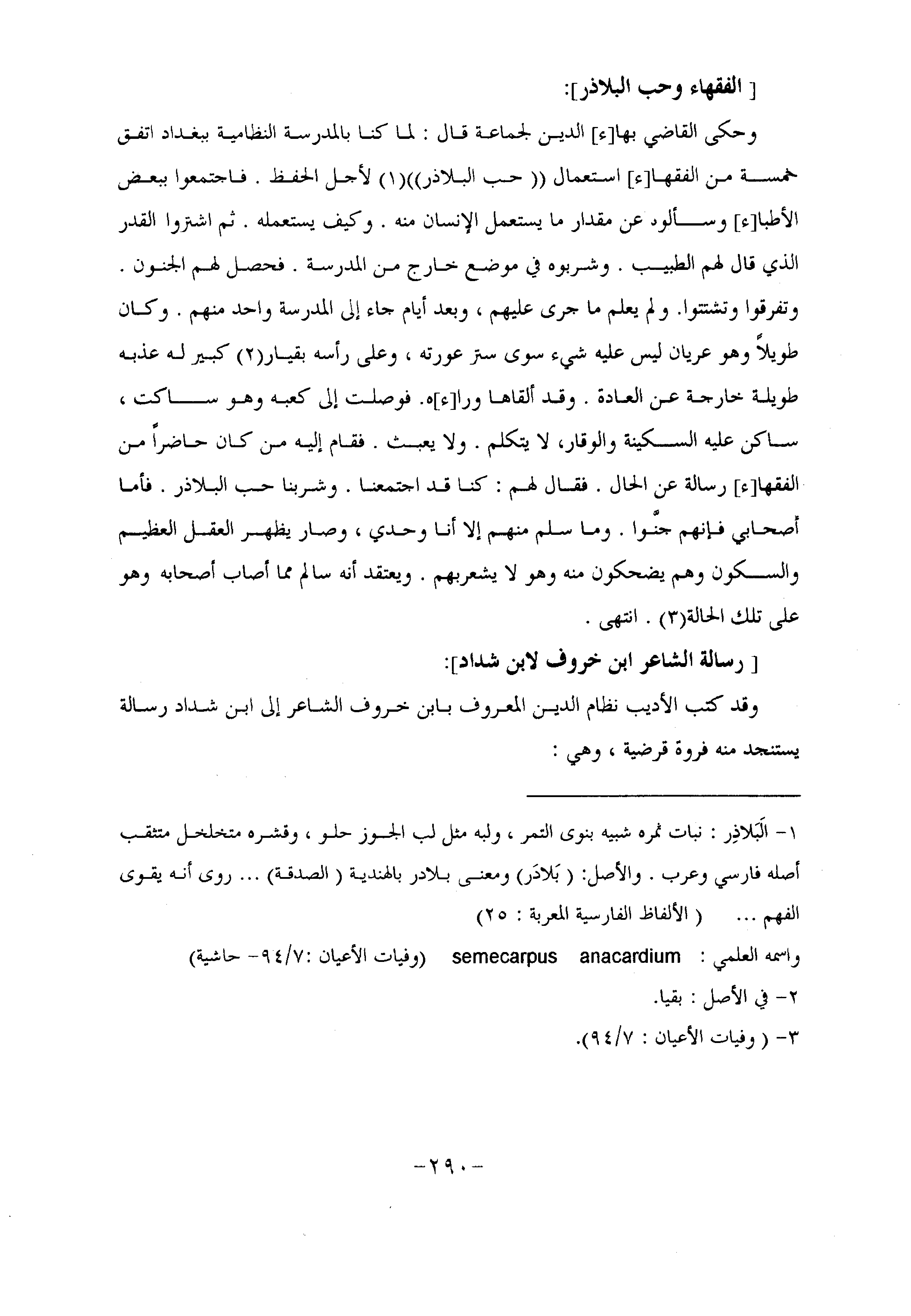 وحكى القاضي بها [ء] الدين لجماعة قال: لما كنا بالمدرسة النظامية ببغداد اتفق خمسة من الفقها [ء] استعمال «حب البلاذر» «1» لأجل الحفظ. فاجتمعوا ببعض الأطبا [ء] وسألوه عن مقدار ما يستعمل الإنسان منه. وكيف يستعمله. ثم اشتروا القدر الذي قال لهم الطبيب. وشربوه في موضع خارج من المدرسة. فحصل لهم الجنون.