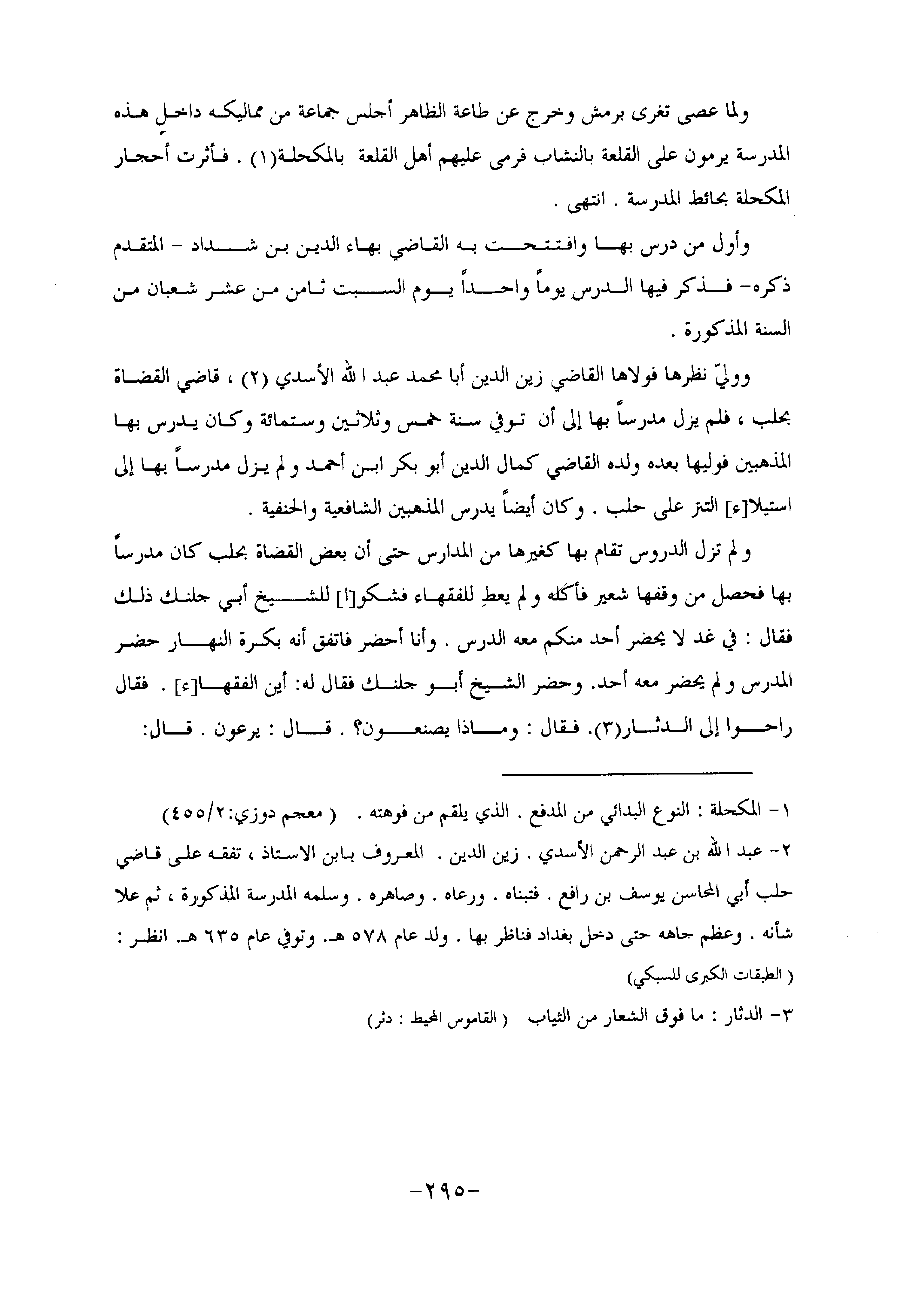 ولم تزل الدروس تقام بها كغيرها من المدارس حتى أن بعض القضاة بحلب كان مدرسا بها فحصل من وقفها شعير فأكله ولم يعط للفقهاء فشكو [ا] للشيخ أبي جلنك ذلك فقال: في غد لا يحضر أحد منكم معه الدرس. وأنا أحضر فاتفق أنه بكرة النهار حضر المدرس ولم يحضر معه أحد. وحضر الشيخ أبو جلنك فقال له: أين الفقها [ء] . فقال راحوا إلى الدثار «3» . فقال: وماذا يصنعون؟. قال: يرعون. قال: