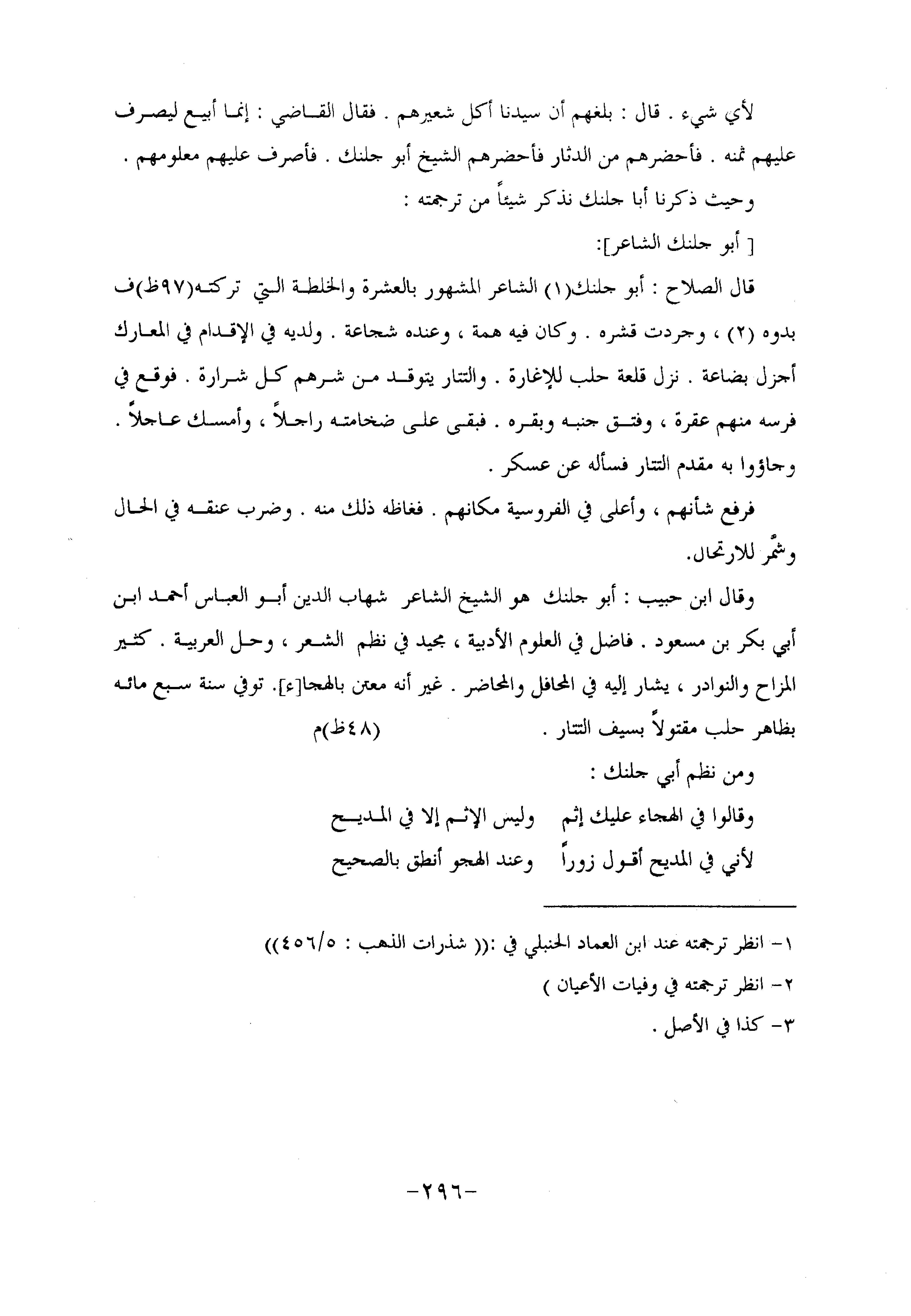وقال ابن حبيب: أبو جلنك هو الشيخ الشاعر شهاب الدين أبو العباس أحمد ابن أبي بكر بن مسعود. فاضل في العلوم الأدبية، مجيد في نظم الشعر، وحل العربية. كثير المزاح والنوادر، يشار إليه في المحافل والمحاضر. غير أنه معتن بالهجا [ء] . توفي سنة سبع مائة بظاهر حلب مقتولا بسيف التتار. (48 ظ) م