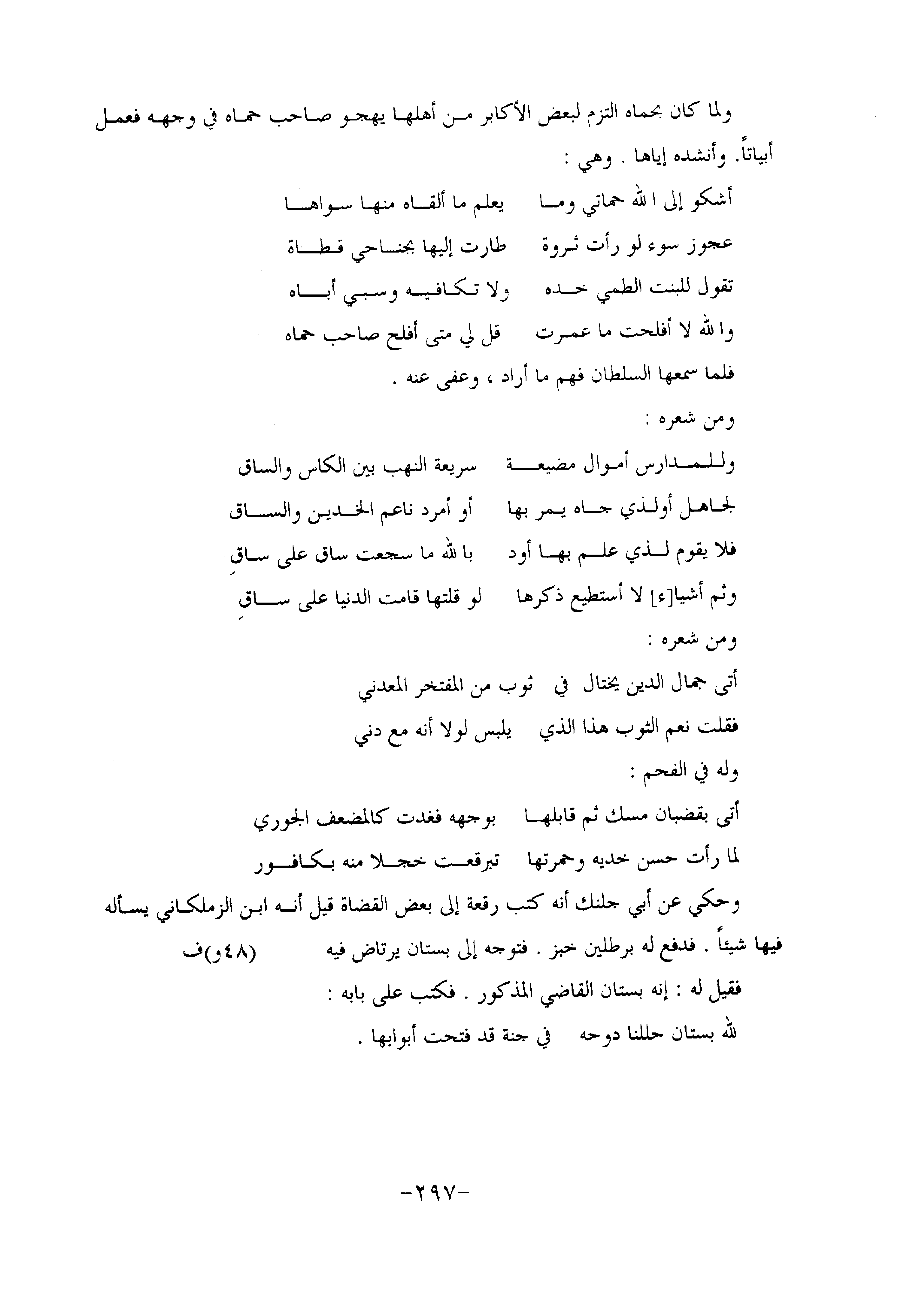 ولما كان بحماه التزم لبعض الأكابر من أهلها يهجو صاحب حماه في وجهه فعمل أبياتا. وأنشده إياها. وهي: