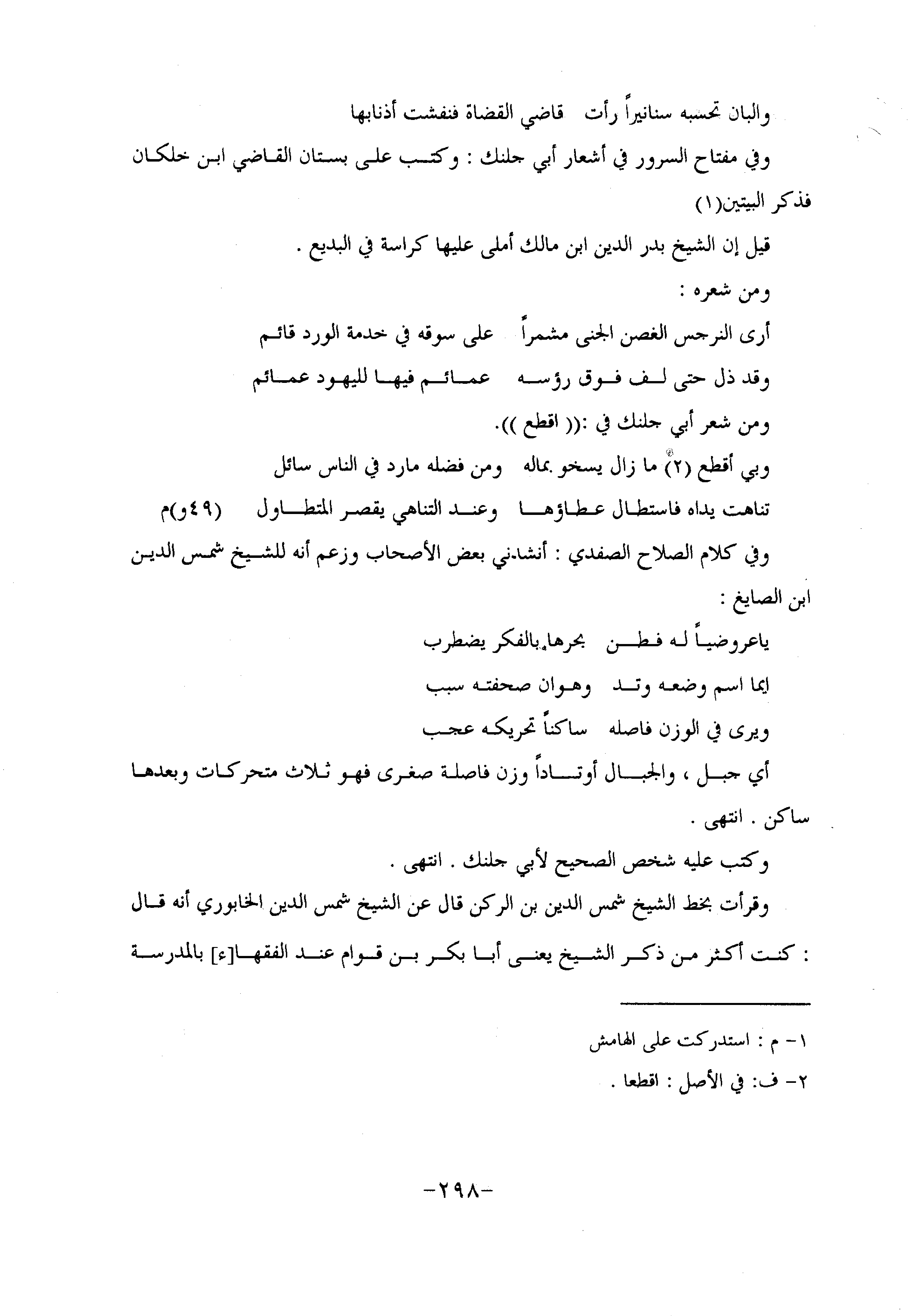 وفي مفتاح السرور في أشعار أبي جلنك: وكتب على بستان القاضي ابن خلكان فذكر البيتين «1»