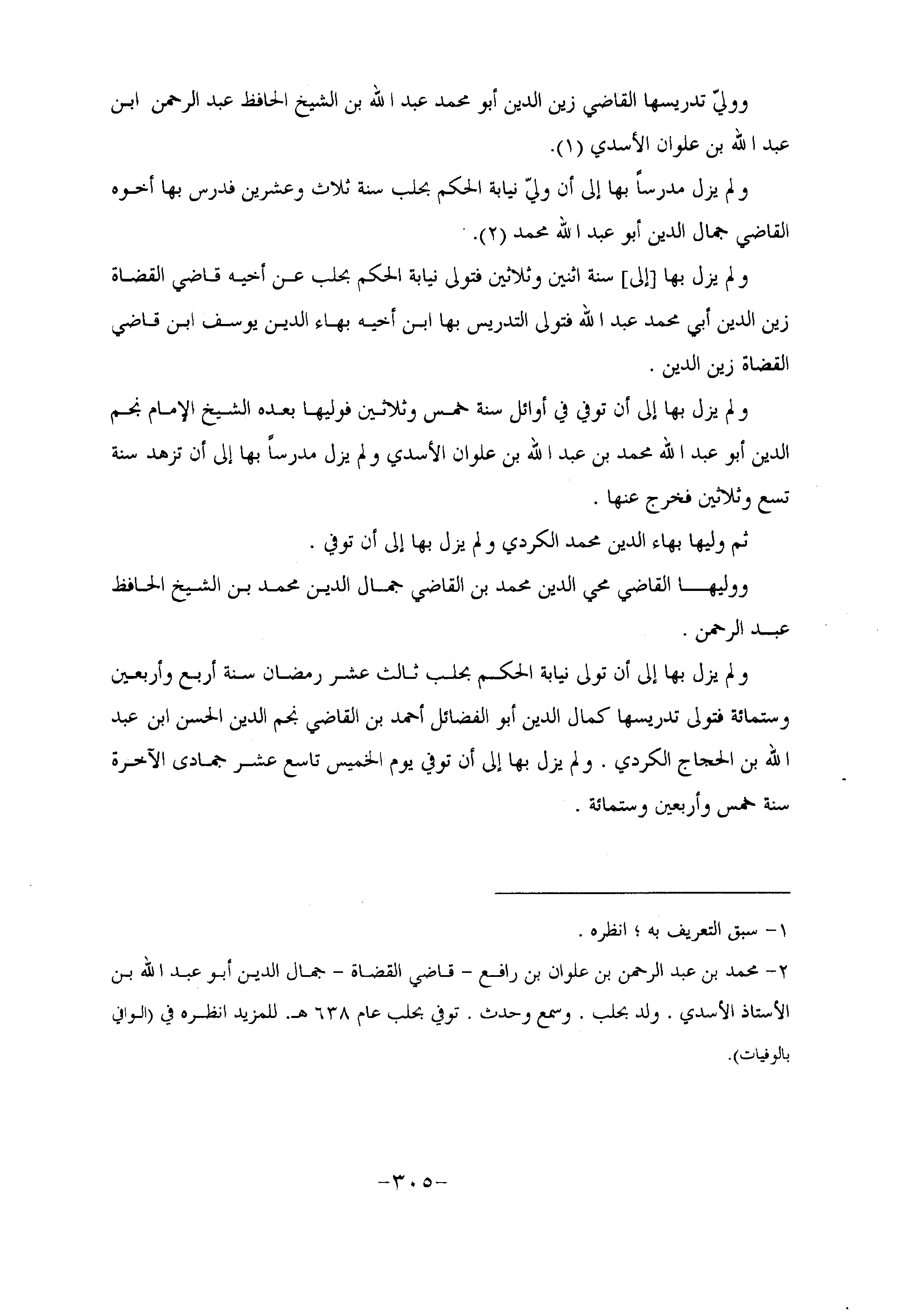 ولم يزل بها [إلى] سنة اثنين وثلاثين فتولى نيابة الحكم بحلب عن أخيه قاضي القضاة زين الدين أبي محمد عبد الله فتولى التدريس بها ابن أخيه بهاء الدين يوسف ابن قاضي القضاة زين الدين.