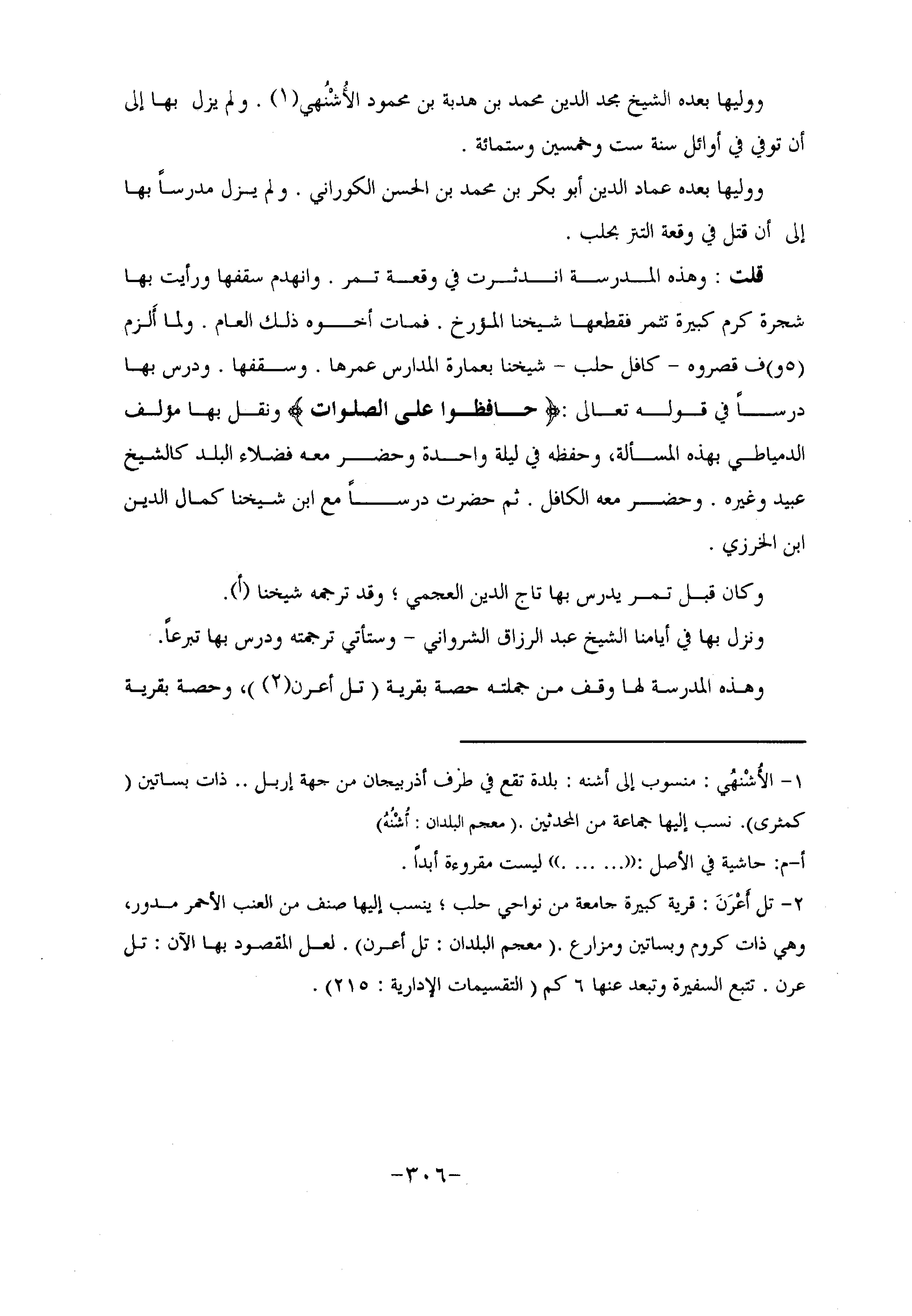 قلت: وهذه المدرسة اندثرت في وقعة تمر. وانهدم سقفها ورأيت بها شجرة كرم كبيرة تثمر فقطعها شيخنا المؤرخ. فمات أخوه ذلك العام. ولما ألزم (5 و) ف قصروه- كافل حلب- شيخنا بعمارة المدارس عمرها. وسقفها. ودرس بها درسا في قوله تعالى: حافِظُوا عَلَى الصَّلَواتِ