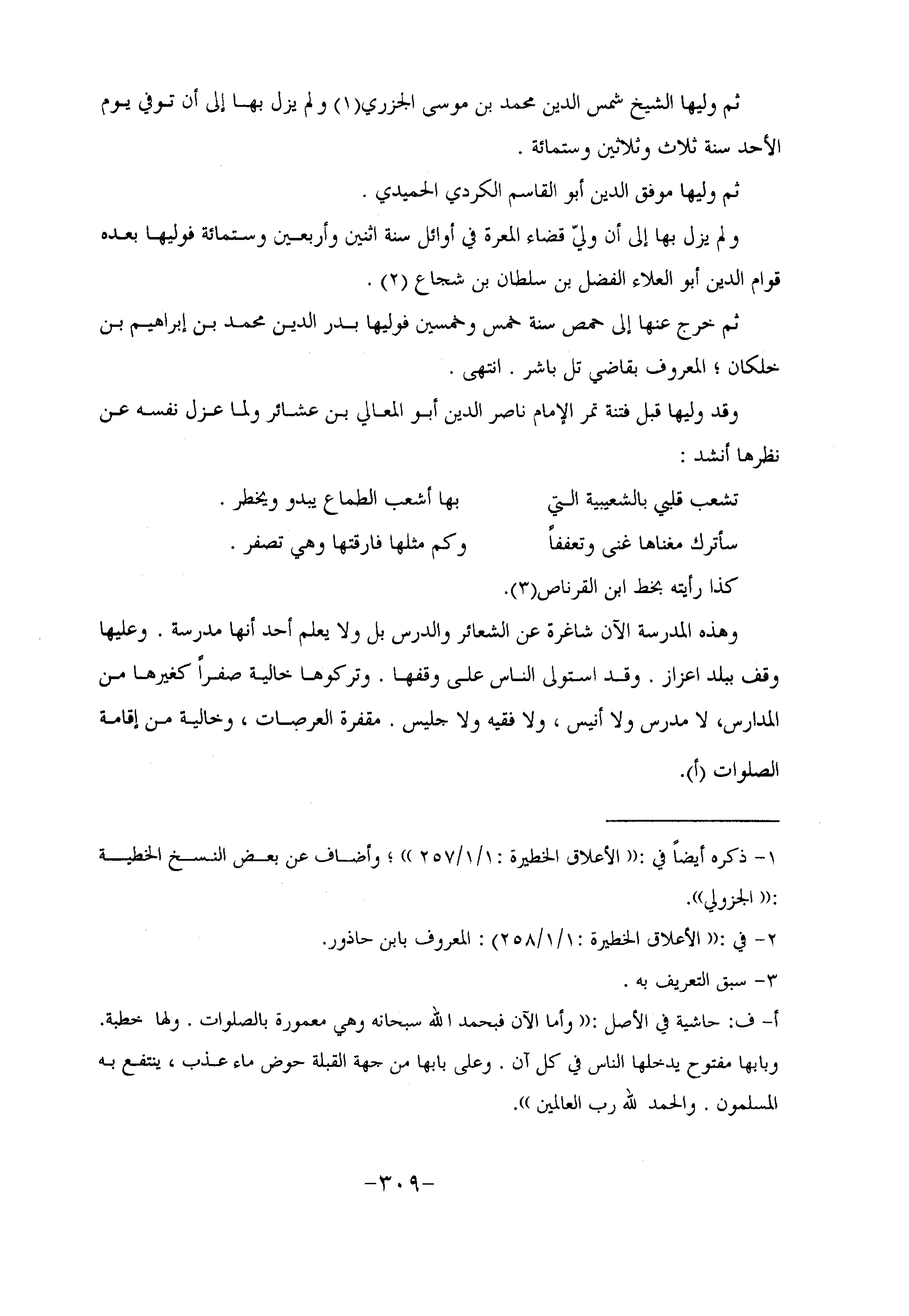 وهذه المدرسة الآن شاغرة عن الشعائر والدرس بل ولا يعلم أحد أنها مدرسة. وعليها وقف ببلد اعزاز. وقد استولى الناس على وقفها. وتركوها خالية صفرا كغيرها من المدارس، لا مدرس ولا أنيس، ولا فقيه ولا جليس. مقفرة العرصات، وخالية من إقامة الصلوات أ.