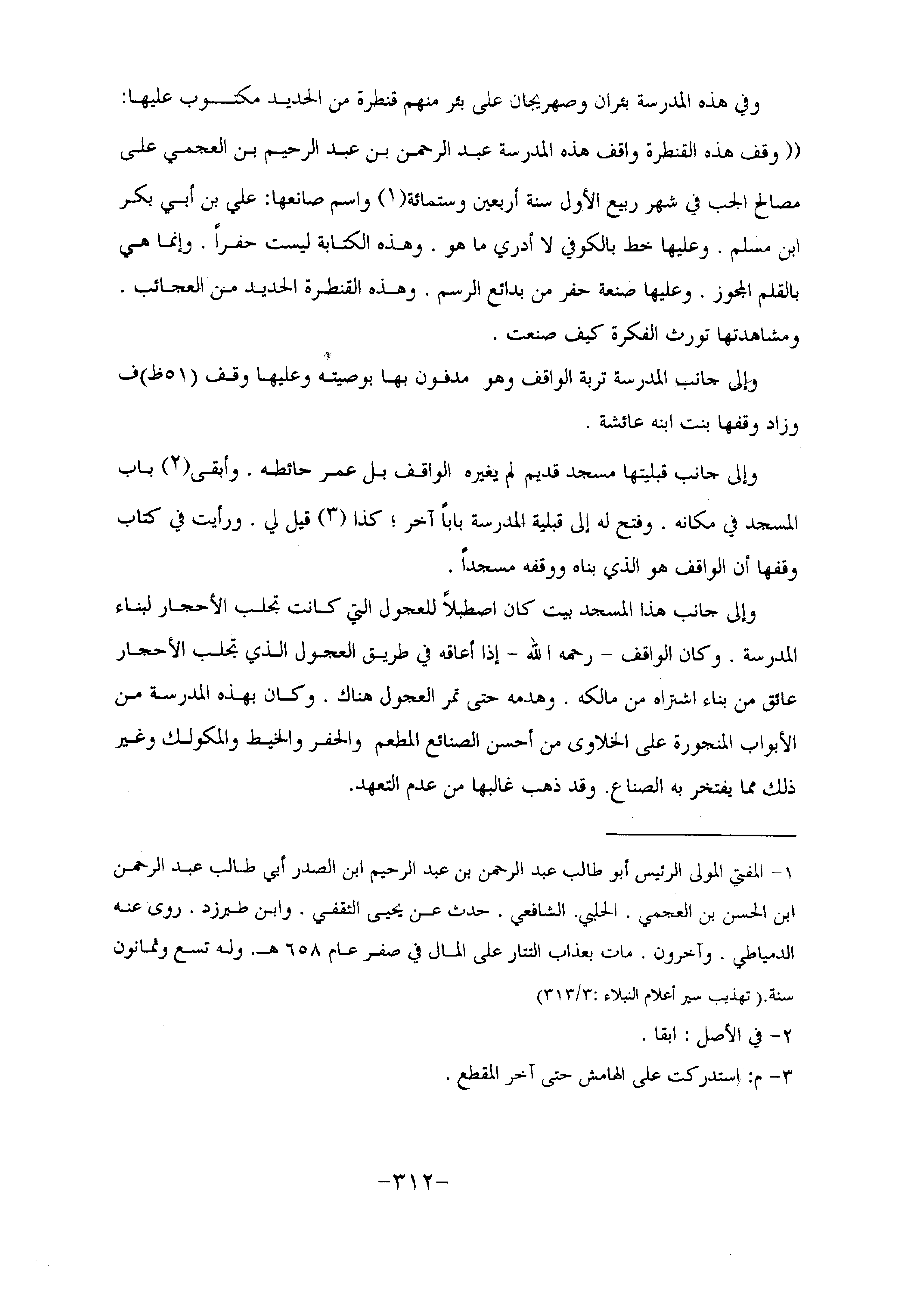 «وقف هذه القنطرة واقف هذه المدرسة عبد الرحمن بن عبد الرحيم بن العجمي على مصالح الجب في شهر ربيع الأول سنة أربعين وستمائة «1» واسم صانعها: علي بن أبي بكر ابن مسلم. وعليها خط بالكوفي لا أدري ما هو. وهذه الكتابة ليست حفرا. وإنما هي بالقلم المجوز. وعليها صنعة حفر من بدائع الرسم. وهذه القنطرة الحديد من العجائب.