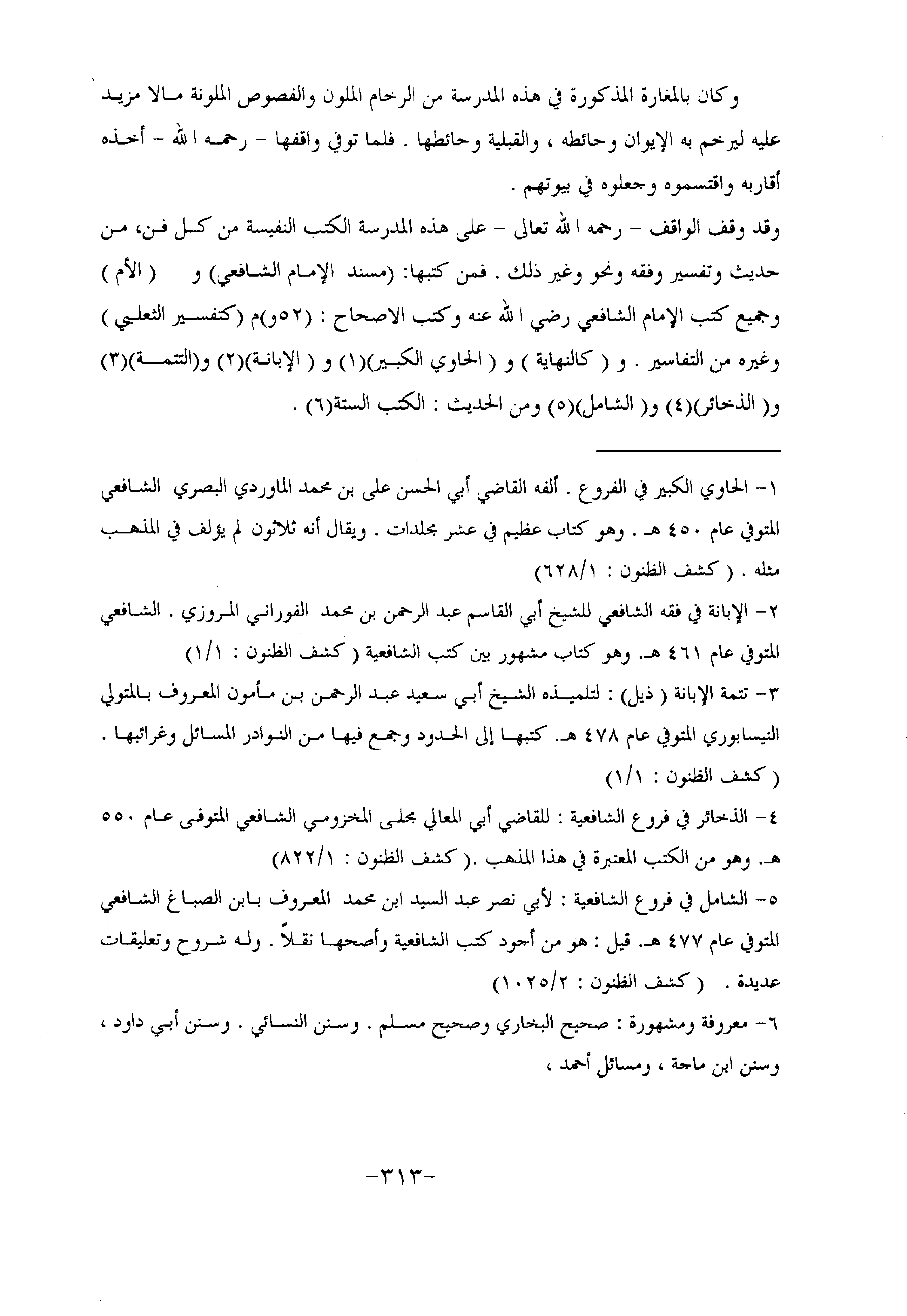 وقد وقف الواقف- رحمه الله تعالى- على هذه المدرسة الكتب النفيسة من كل فن، من حديث وتفسير وفقه ونحو وغير ذلك. فمن كتبها: (مسند الإمام الشافعي) و (الأم) وجميع كتب الإمام الشافعي رضي الله عنه وكتب الاصحاح: (52 و) م (كتفسير الثعلبي) وغيره من التفاسير. و (كالنهاية) و (الحاوي الكبير) «1» و (الإبانة) «2» و (التتمة) «3» و (الذخائر) «4» و (الشامل) «5» ومن الحديث: الكتب الستة «6» .