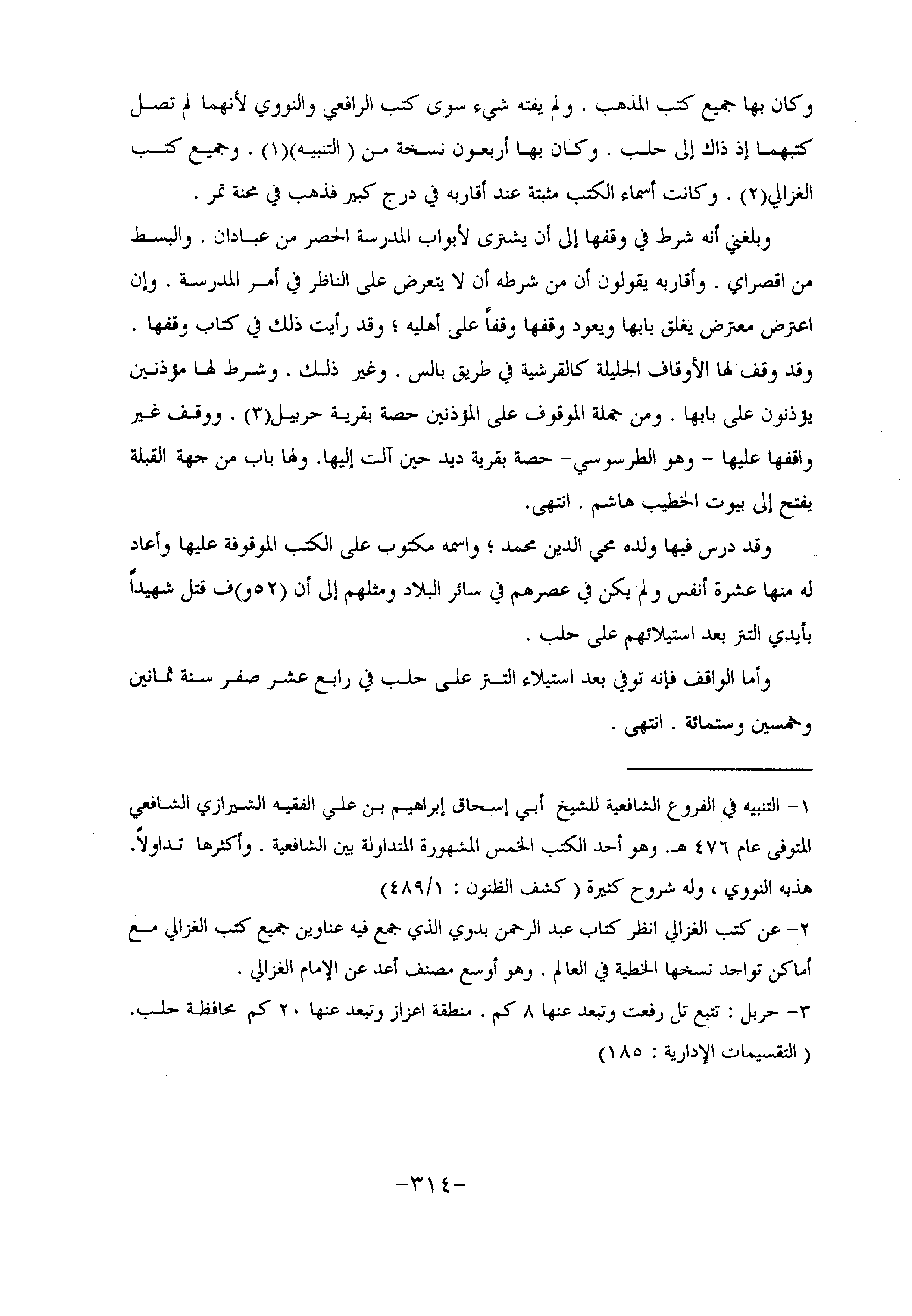 وقد درس فيها ولده محي الدين محمد؛ واسمه مكتوب على الكتب الموقوفة عليها وأعاد له منها عشرة أنفس ولم يكن في عصرهم في سائر البلاد ومثلهم إلى أن (52 و) ف قتل شهيدا بأيدي التتر بعد استيلائهم على حلب.