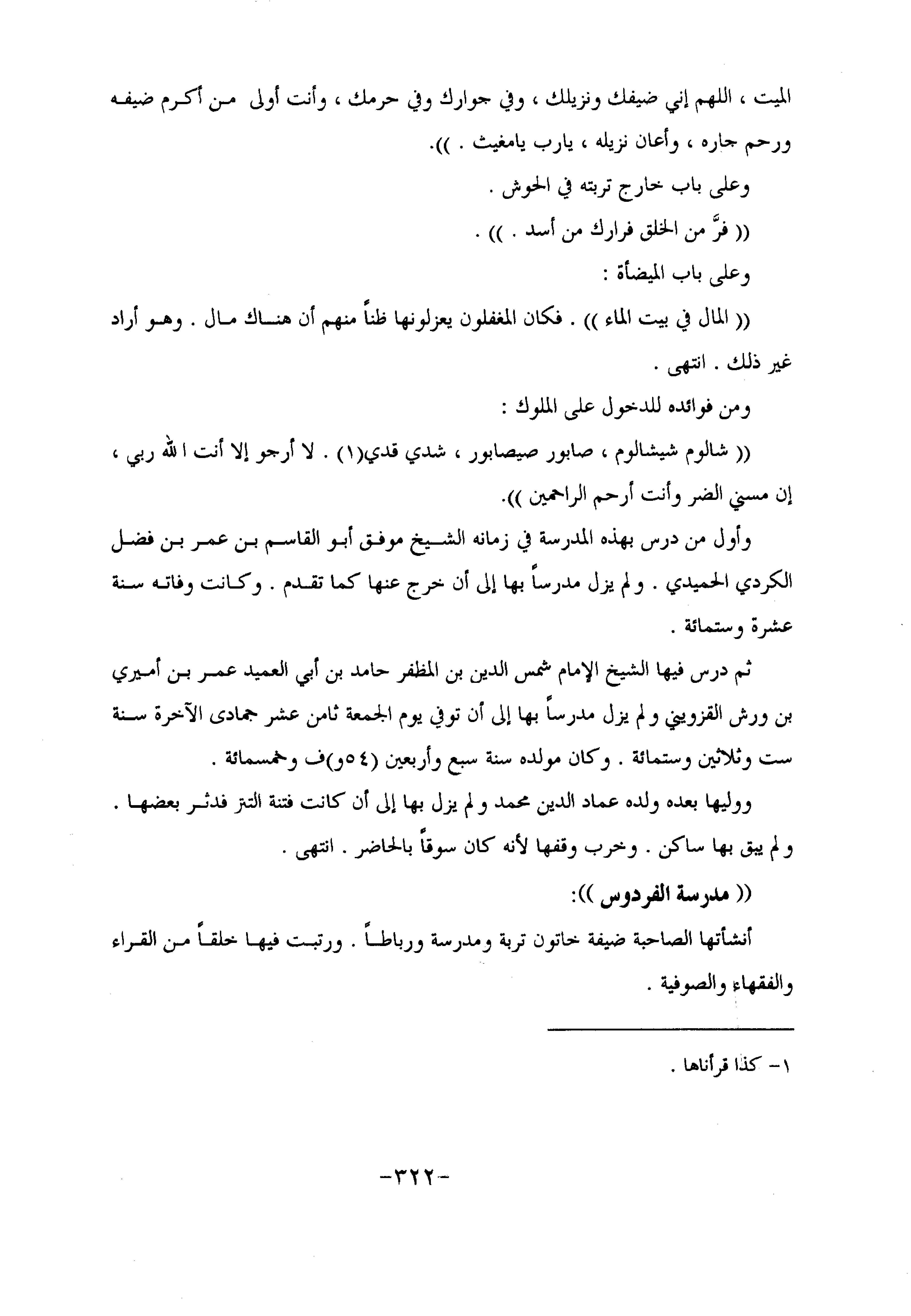 ثم درس فيها الشيخ الإمام شمس الدين بن المظفر حامد بن أبي العميد عمر بن أميري بن ورش القزويني ولم يزل مدرسا بها إلى أن توفي يوم الجمعة ثامن عشر جمادى الآخرة سنة ست وثلاثين وستمائة. وكان مولده سنة سبع وأربعين (54 و) ف وخمسمائة.