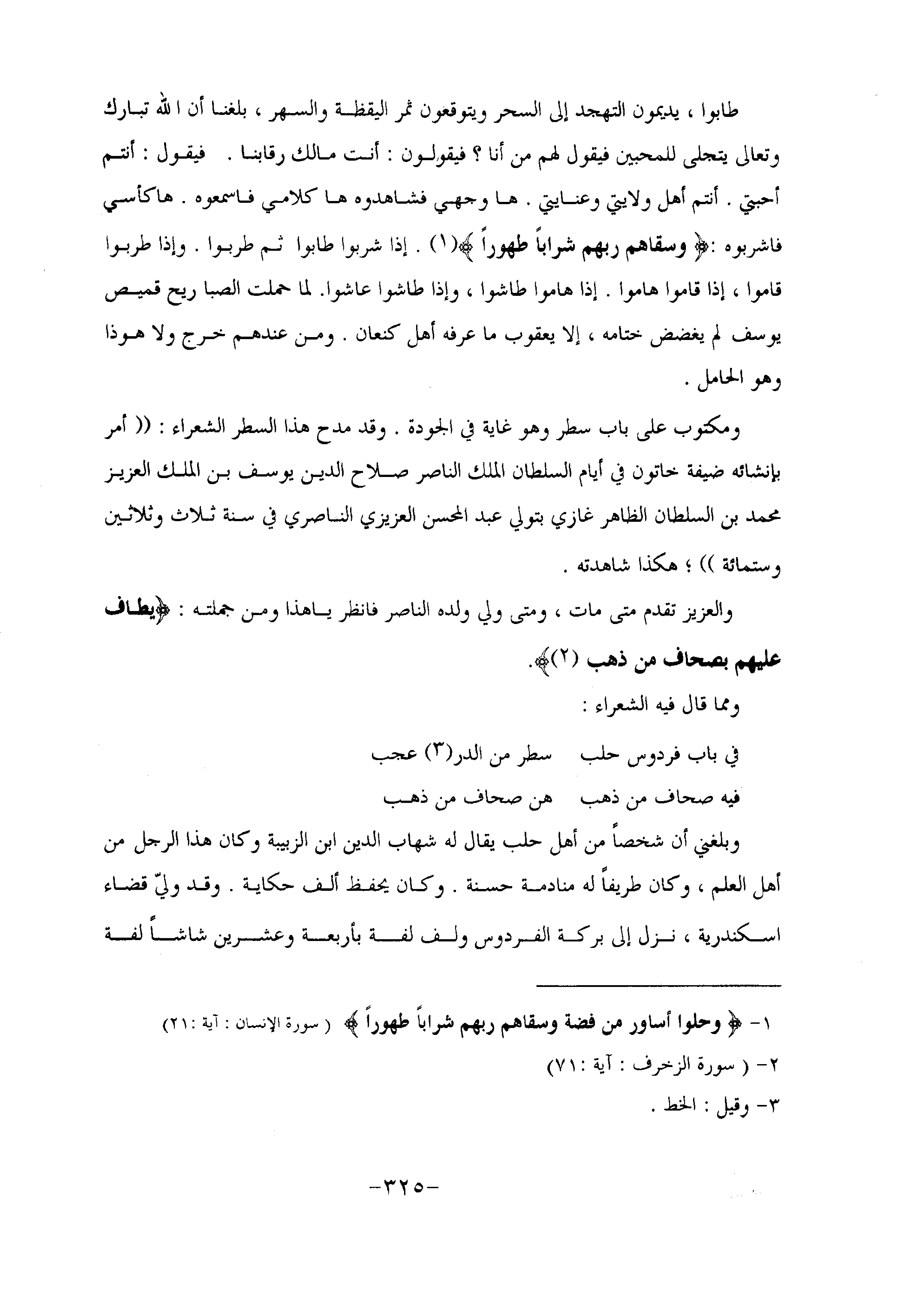 والعزيز تقدم متى مات، ومتى ولي ولده الناصر فانظر يا هذا ومن جملته: يُطافُ عَلَيْهِمْ بِصِحافٍ مِنْ ذَهَبٍ «2» .