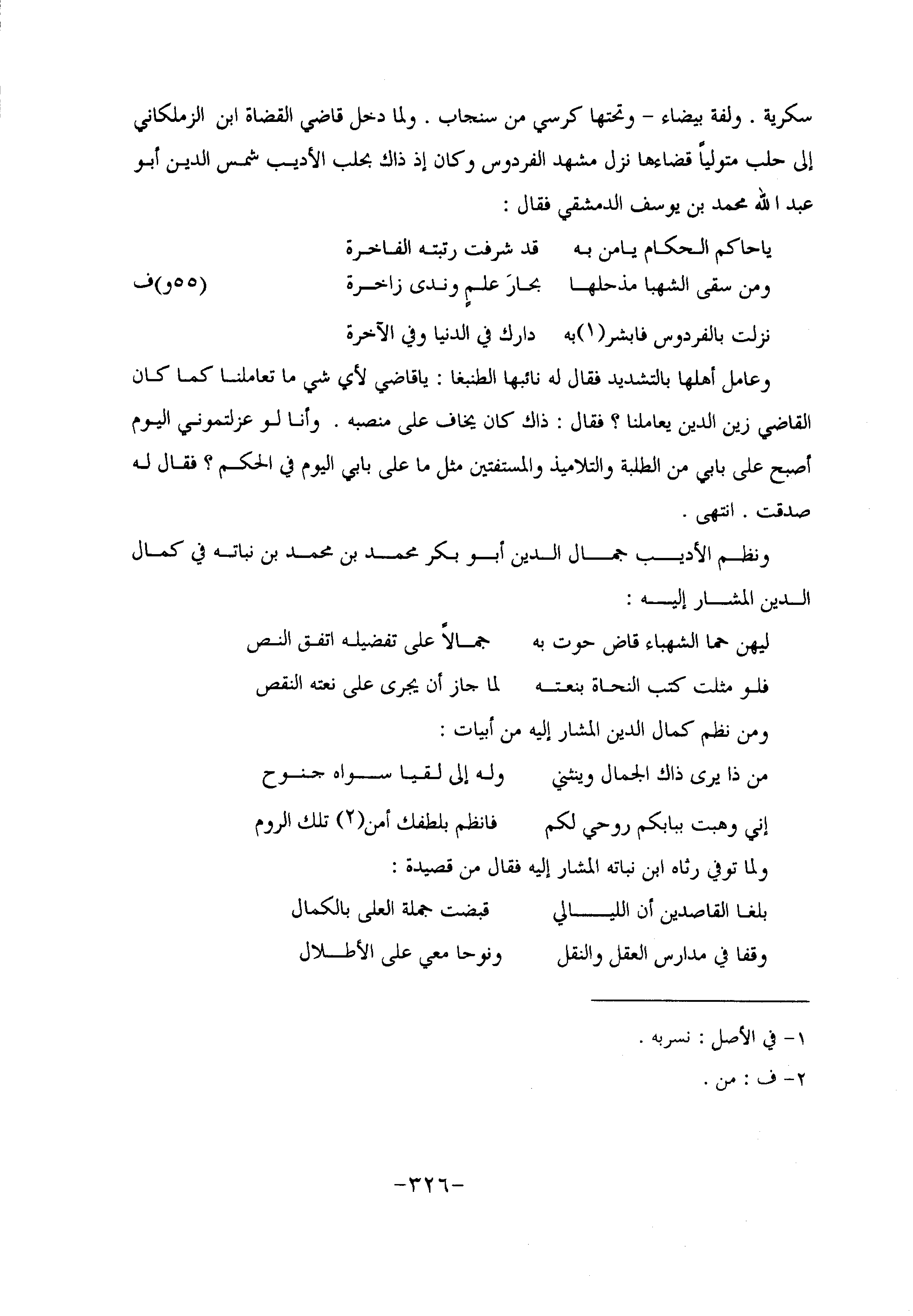 سكرية. ولفة بيضاء- وتحتها كرسي من سنجاب. ولما دخل قاضي القضاة ابن الزملكاني إلى حلب متوليا قضاءها نزل مشهد الفردوس وكان إذ ذاك بحلب الأديب شمس الدين أبو عبد الله محمد بن يوسف الدمشقي فقال:
