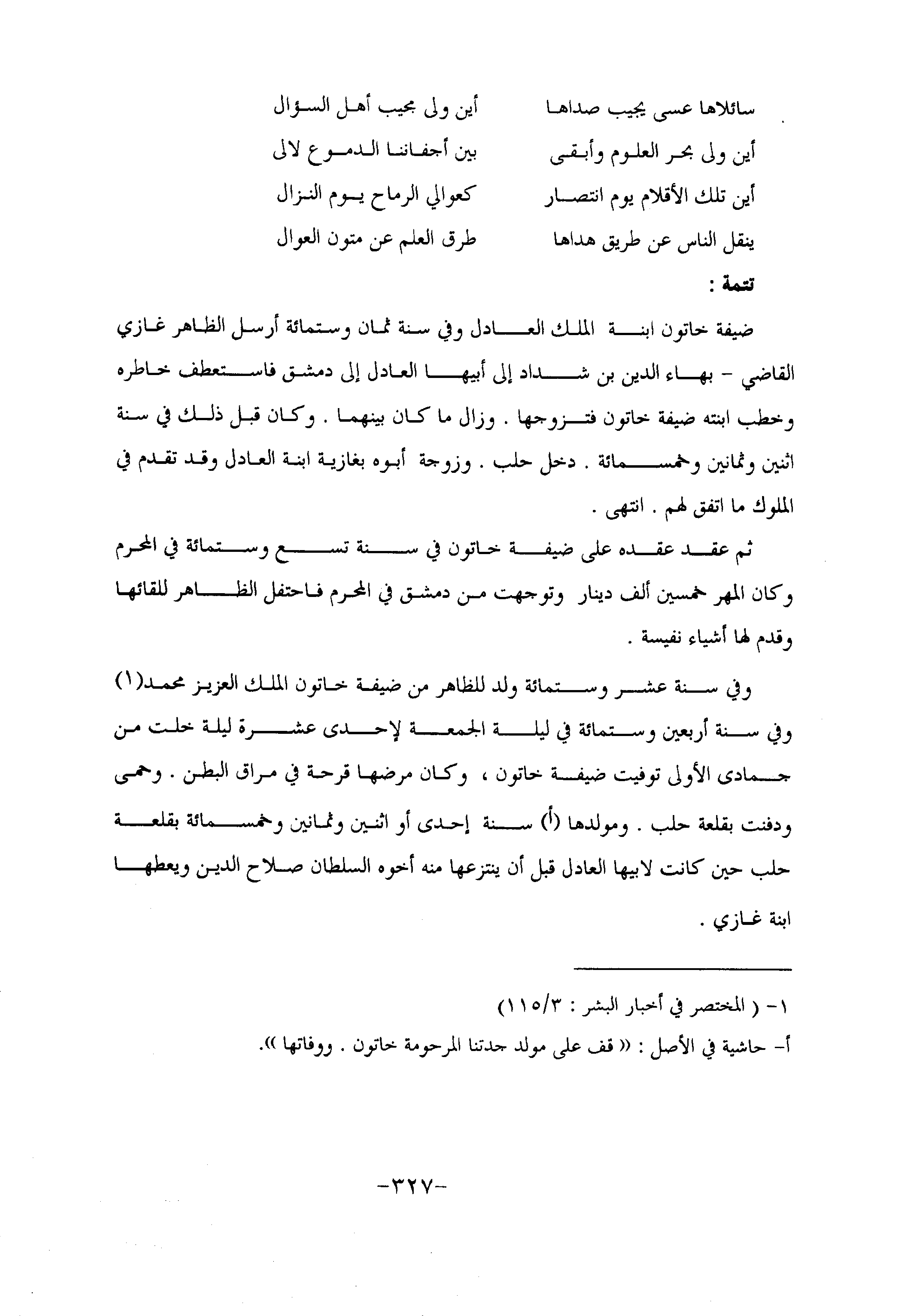وفي سنة عشر وستمائة ولد للظاهر من ضيفة خاتون الملك العزيز محمد «1» وفي سنة أربعين وستمائة في ليلة الجمعة لإحدى عشرة ليلة خلت من جمادى الأولى توفيت ضيفة خاتون، وكان مرضها قرحة في مراق البطن. وحمى ودفنت بقلعة حلب. ومولدها أسنة إحدى أو اثنين وثمانين وخمسمائة بقلعة حلب حين كانت لابيها العادل قبل أن ينتزعها منه أخوه السلطان صلاح الدين ويعطها ابنة غازي.