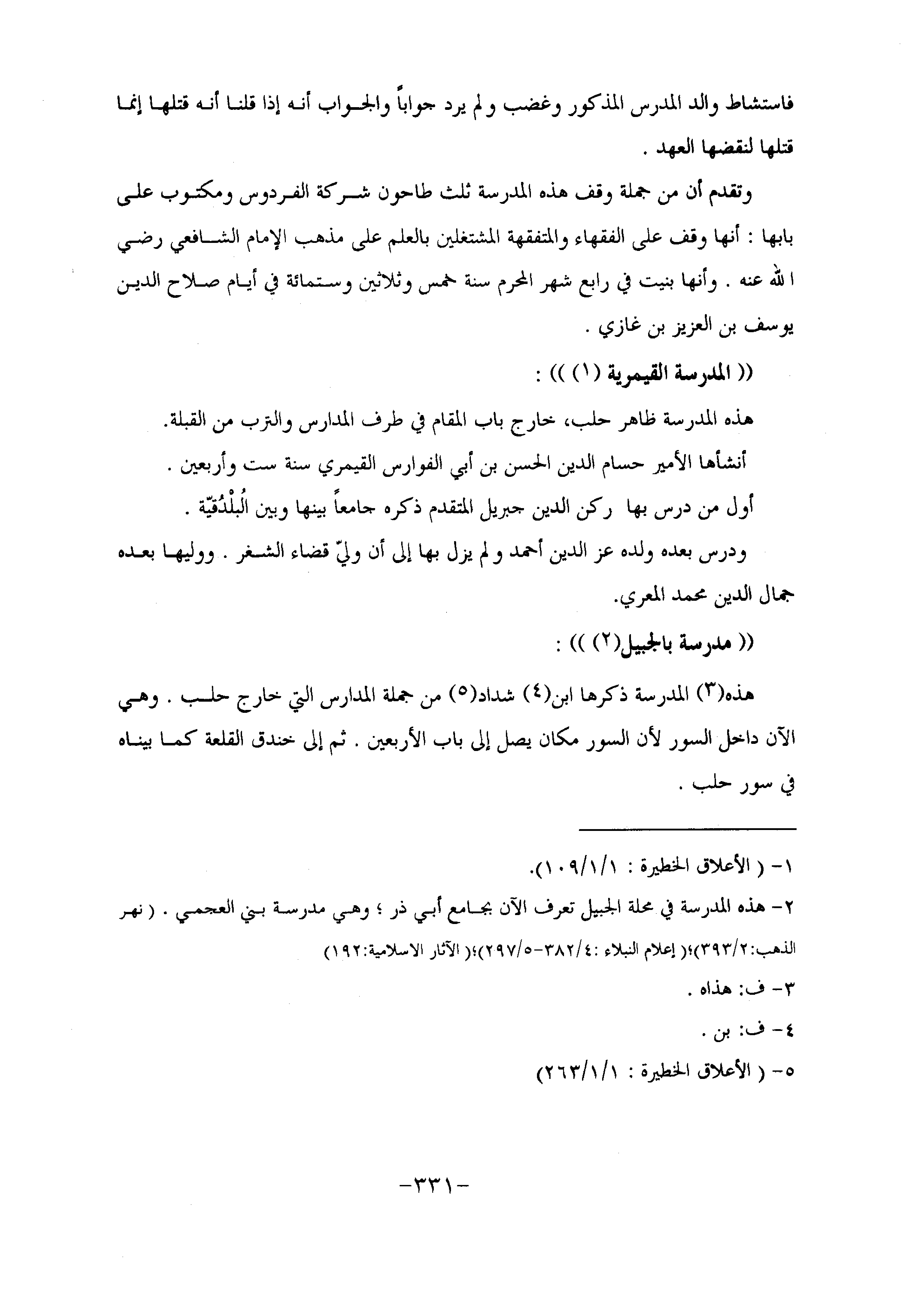 هذه «3» المدرسة ذكرها ابن «4» شداد «5» من جملة المدارس التي خارج حلب. وهي الآن داخل السور لأن السور مكان يصل إلى باب الأربعين. ثم إلى خندق القلعة كما بيناه في سور حلب.
