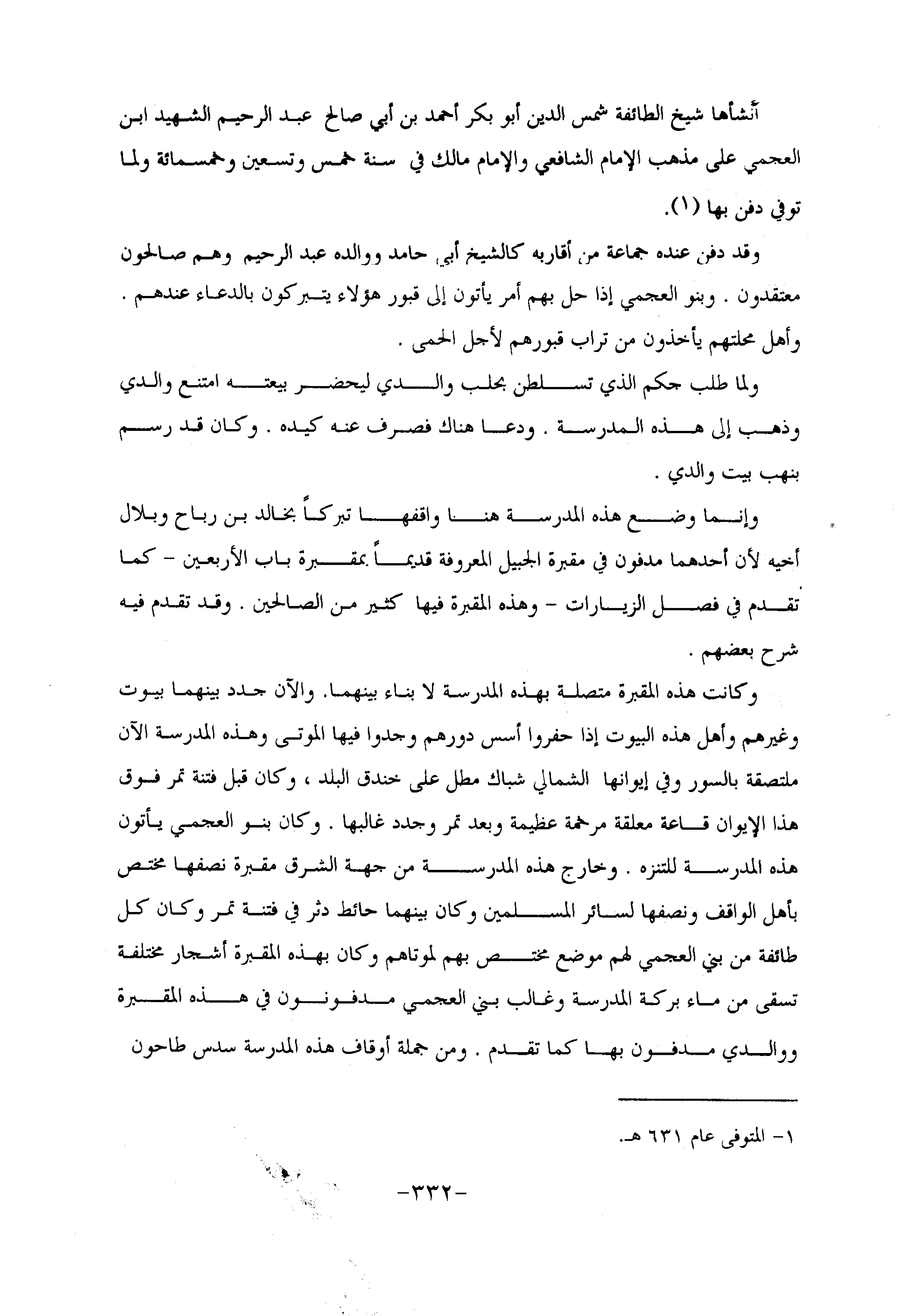 وكانت هذه المقبرة متصلة بهذه المدرسة لا بناء بينهما. والآن جدد بينهما بيوت وغيرهم وأهل هذه البيوت إذا حفروا أسس دورهم وجدوا فيها الموتى وهذه المدرسة الآن ملتصقة بالسور وفي إيوانها الشمالي شباك مطل على خندق البلد، وكان قبل فتنة تمر فوق هذا الإيوان قاعة معلقة مرخمة عظيمة وبعد تمر وجدد غالبها. وكان بنو العجمي يأتون هذه المدرسة للتنزه. وخارج هذه المدرسة من جهة الشرق مقبرة نصفها مختص بأهل الواقف ونصفها لسائر المسلمين وكان بينهما حائط دثر في فتنة تمر وكان كل طائفة من بني العجمي لهم موضع مختص بهم لموتاهم وكان بهذه المقبرة أشجار مختلفة تسقى من ماء بركة المدرسة وغالب بني العجمي مدفونون في هذه المقبرة ووالدي مدفون بها كما تقدم. ومن جملة أوقاف هذه المدرسة سدس طاحون