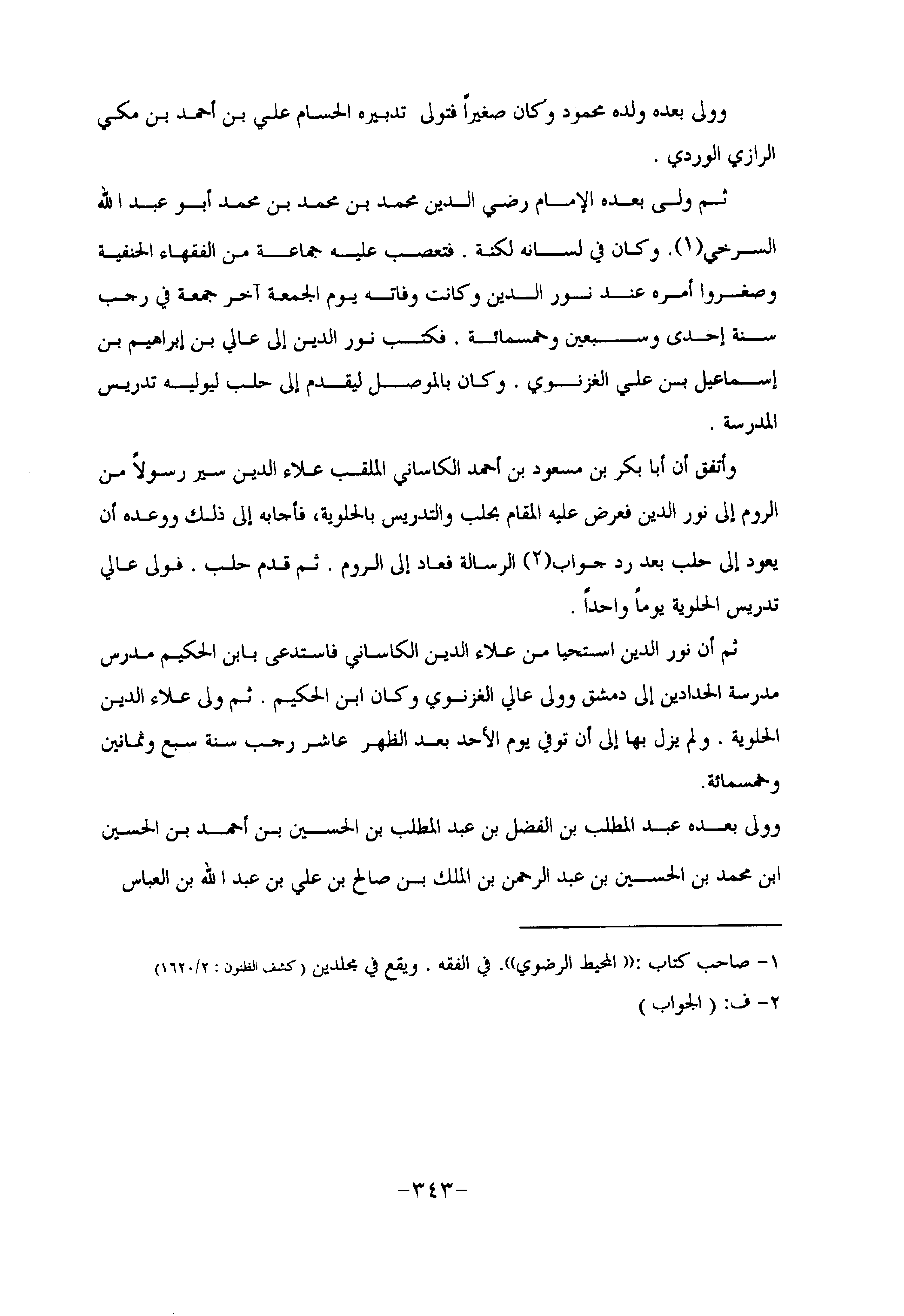 وأتفق أن أبا بكر بن مسعود بن أحمد الكاساني الملقب علاء الدين سير رسولا من الروم إلى نور الدين فعرض عليه المقام بحلب والتدريس بالحلوية، فأجابه إلى ذلك ووعده أن يعود إلى حلب بعد رد جواب «2» الرسالة فعاد إلى الروم. ثم قدم حلب. فولى عالي تدريس الحلوية يوما واحدا.