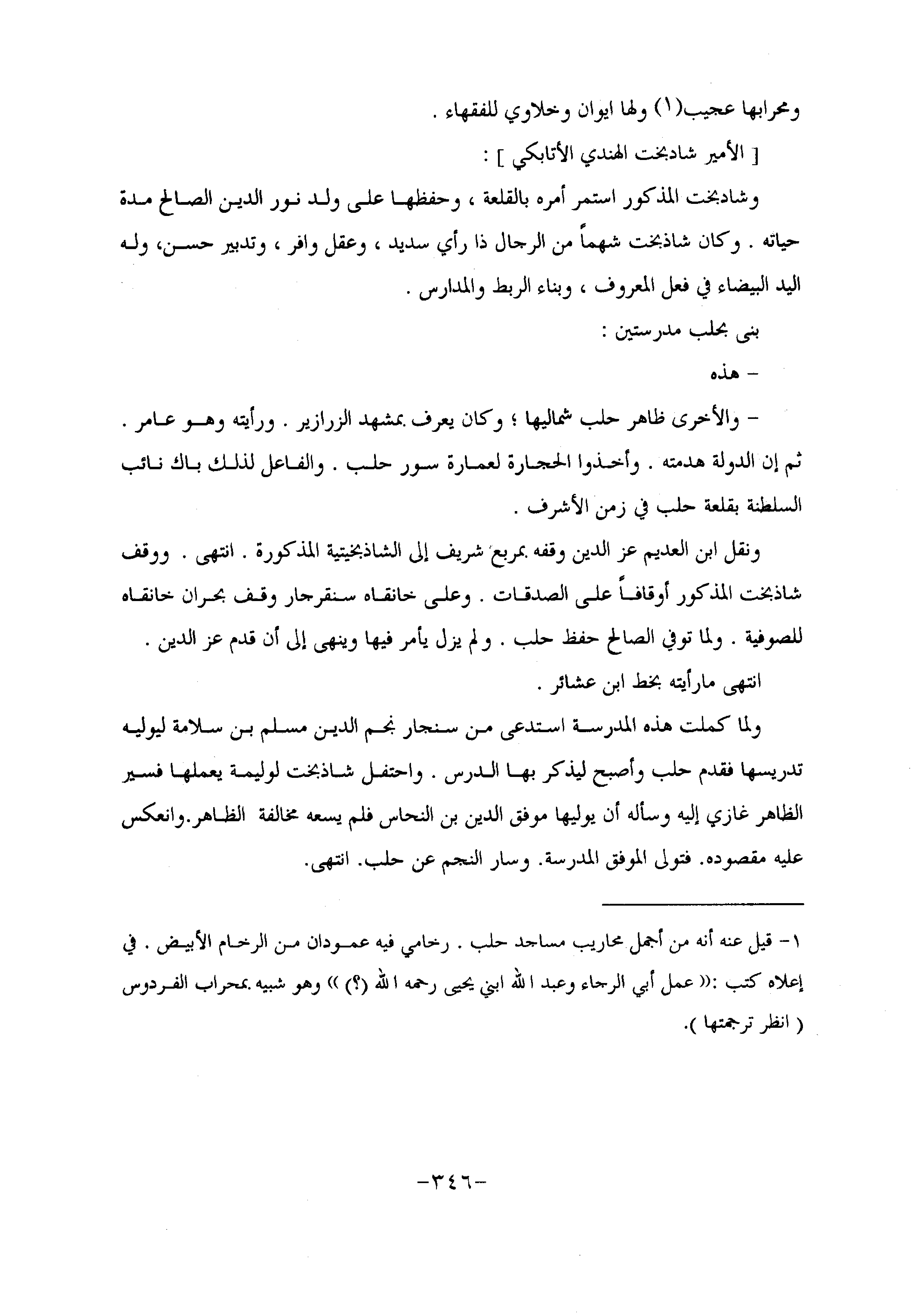 ونقل ابن العديم عز الدين وقفه بمربع شريف إلى الشاذبخيتية المذكورة. انتهى. ووقف شاذبخت المذكور أوقافا على الصدقات. وعلى خانقاه سنقر جار وقف بحران خانقاه للصوفية. ولما توفي الصالح حفظ حلب. ولم يزل يأمر فيها وينهى إلى أن قدم عز الدين.