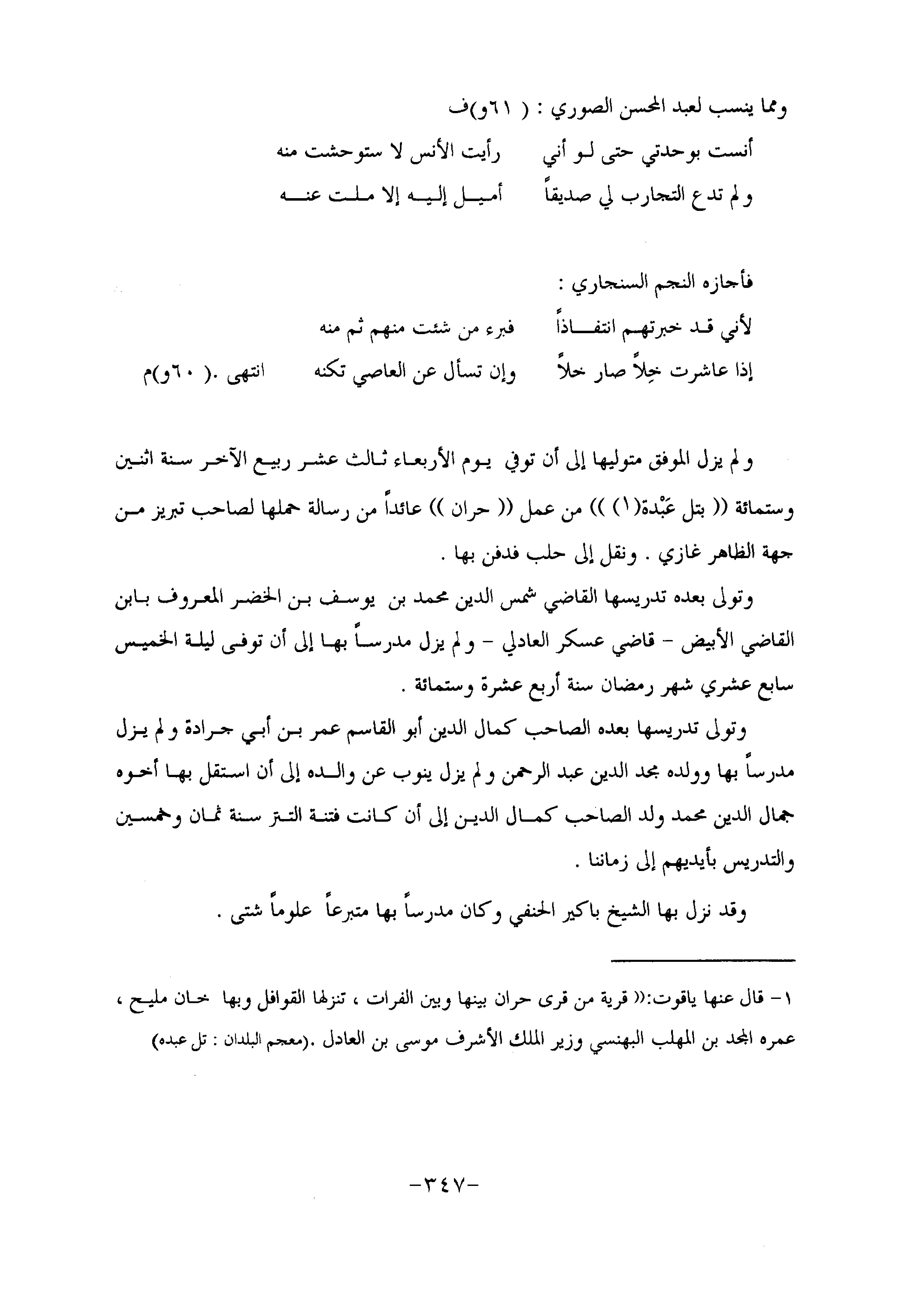 وتولى تدريسها بعده الصاحب كمال الدين أبو القاسم عمر بن أبي جرادة ولم يزل مدرسا بها وولده مجد الدين عبد الرحمن ولم يزل ينوب عن والده إلى أن استقل بها أخوه جمال الدين محمد ولد الصاحب كمال الدين إلى أن كانت فتنة التتر سنة ثمان وخمسين والتدريس بأيديهم إلى زماننا.